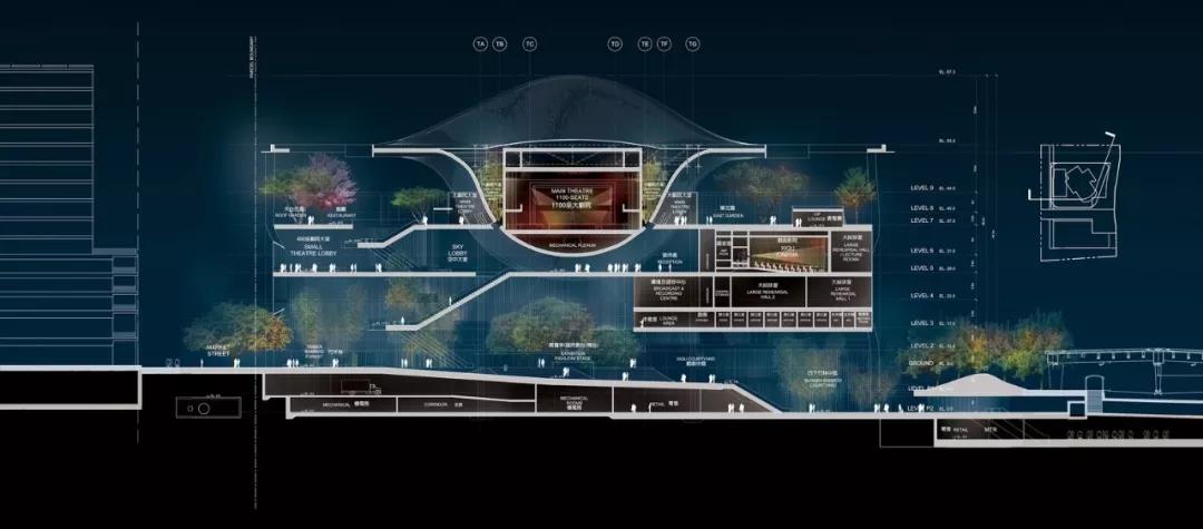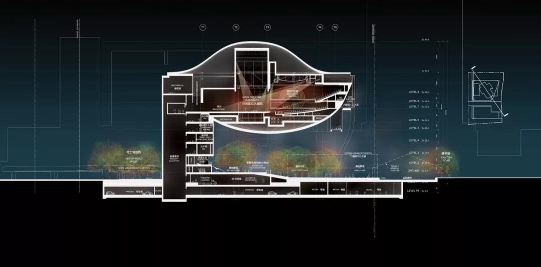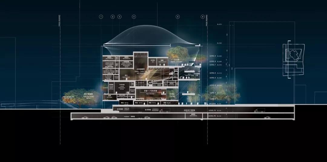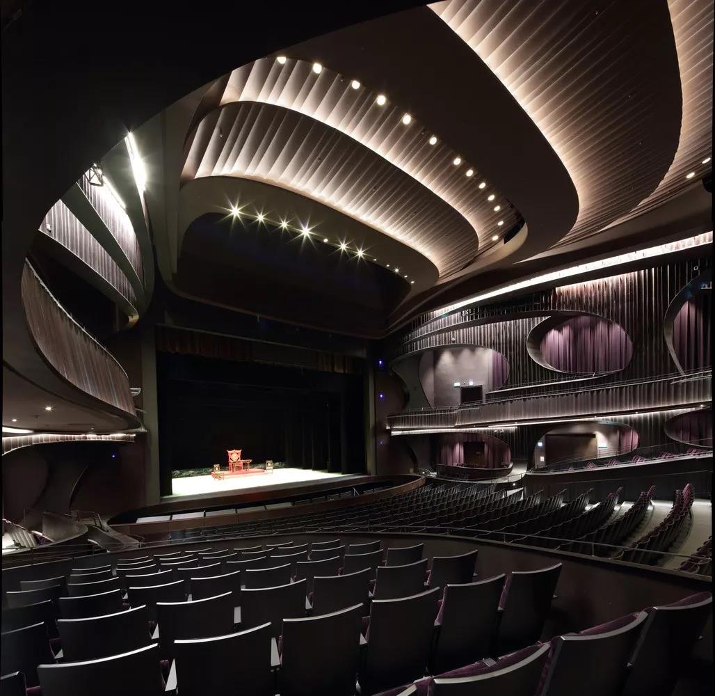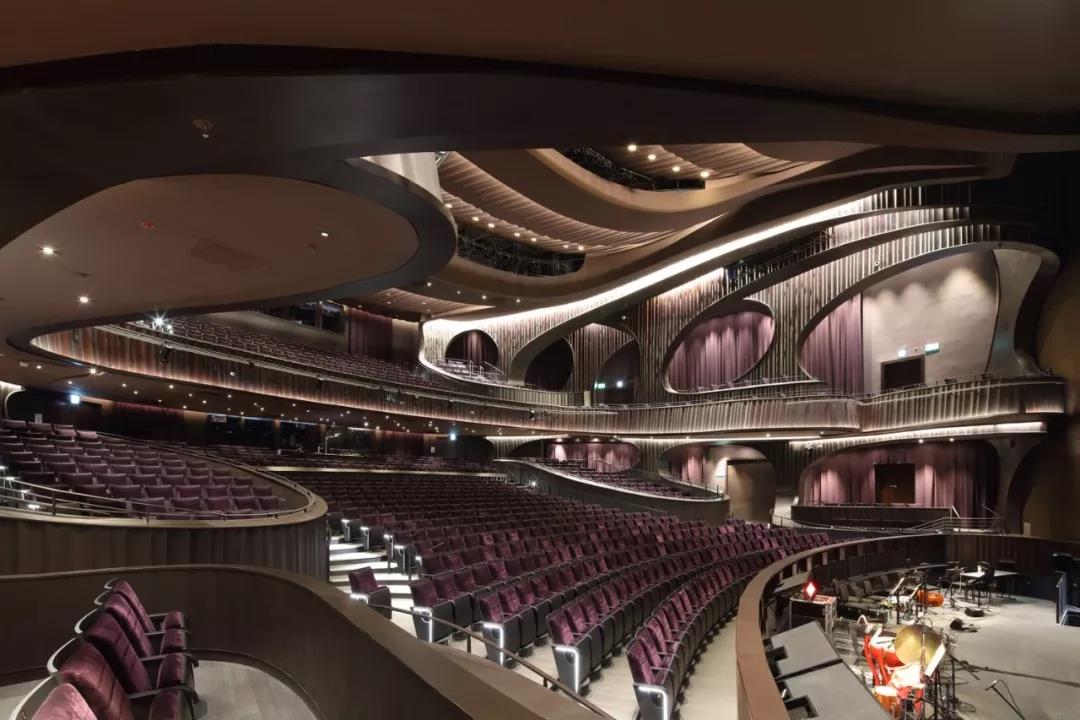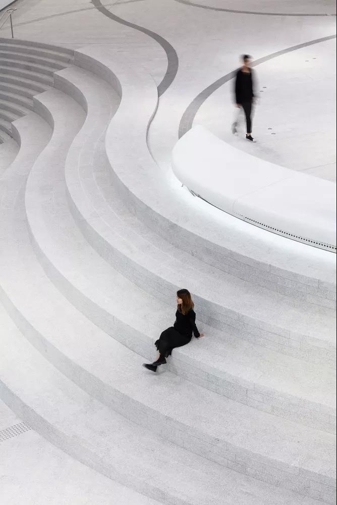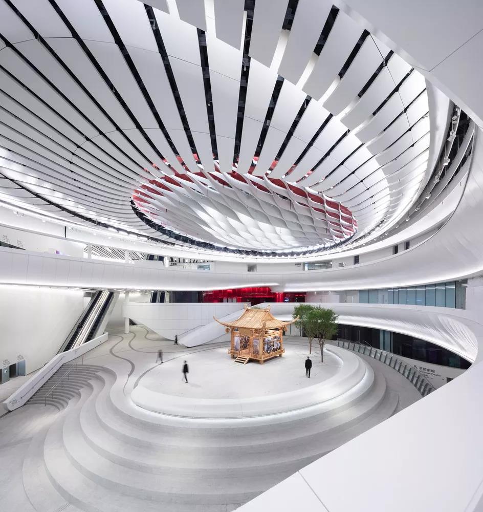 “氣” 的概念貫穿整個建筑,圍繞為多層圓形中庭而設計的曲線路徑、形式和拱形入口。這種創新的設計使可容納1073個座位的大劇院安置于距離地面27米的建筑頂部,方便了中庭和公共廣場的內部配置,同時戰略性地將禮堂與周圍城市基礎設施的振動和高環境噪聲隔離。這一創造性的設計舉措非常有益,能夠使工人安全地在大劇院內部和下方同時進行建設,從而縮短了施工時間。