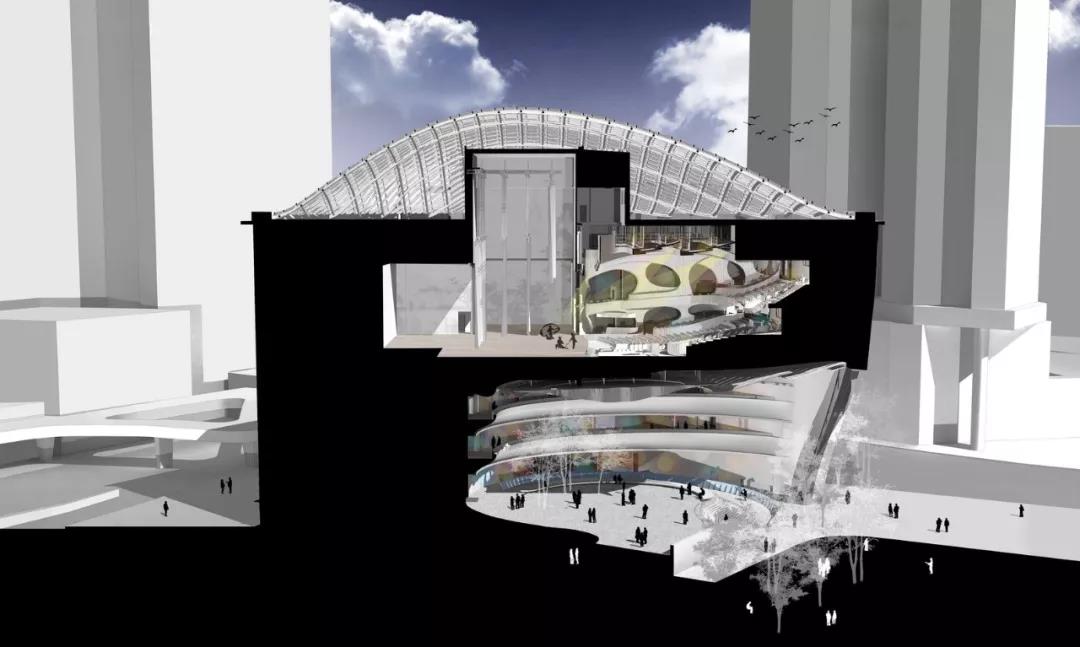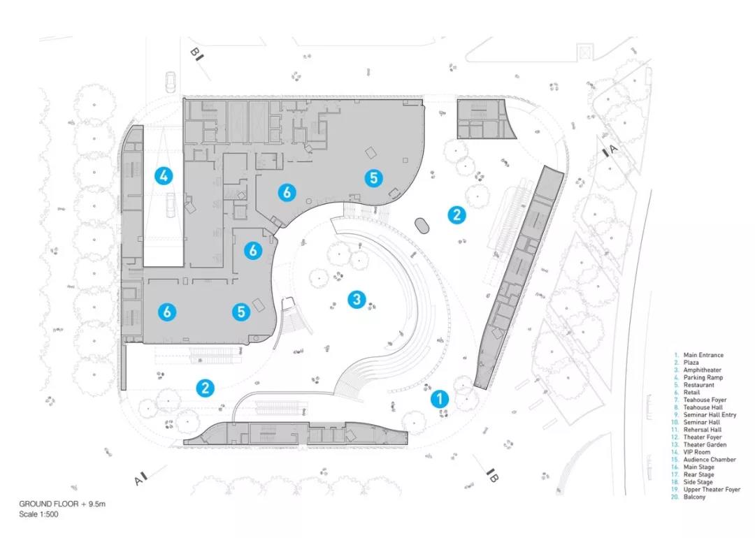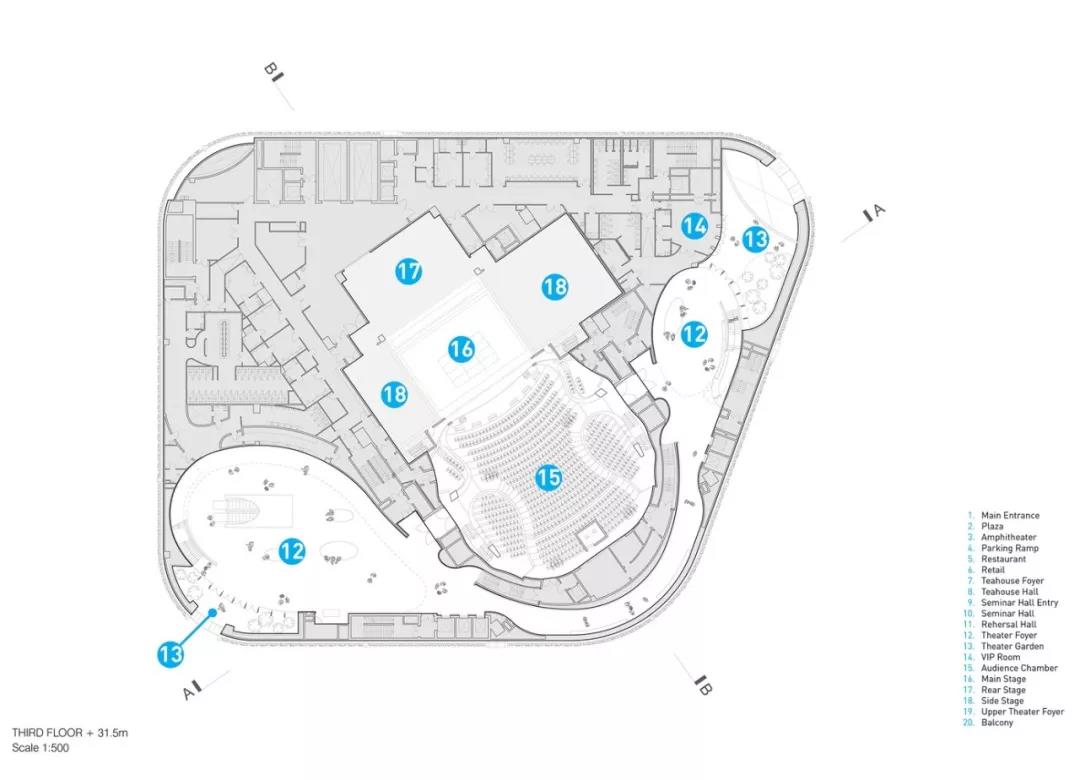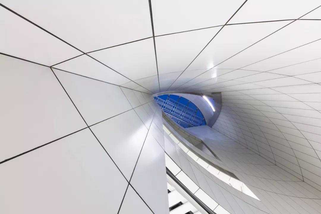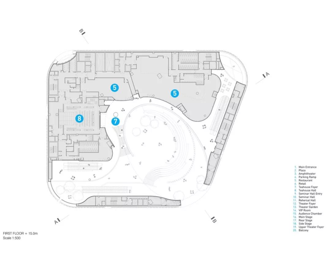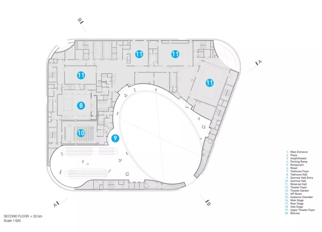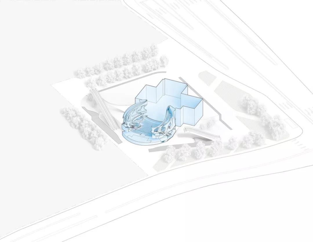 “氣” 的概念貫穿整個建筑,圍繞為多層圓形中庭而設計的曲線路徑、形式和拱形入口。這種創新的設計使可容納1073個座位的大劇院安置于距離地面27米的建筑頂部,方便了中庭和公共廣場的內部配置,同時戰略性地將禮堂與周圍城市基礎設施的振動和高環境噪聲隔離。這一創造性的設計舉措非常有益,能夠使工人安全地在大劇院內部和下方同時進行建設,從而縮短了施工時間。