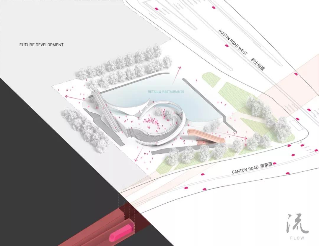 大劇院兩側是兩個戶外空中花園,游客能夠在此欣賞維多利亞港的全景,同時為下面的200個座位的茶室劇院、排練室、教育和行政空間、演講室和零售區創造了空間,可以俯瞰自然通風的內庭院。戲曲中心于2019年1月開業,是一個世界級的表演場所,以一種宏偉的當代表達方式歌頌京劇的文化豐富性,使新觀眾和未來幾代人都能欣賞到它,它也將隨著現代科技的發展繼續茁壯成長。