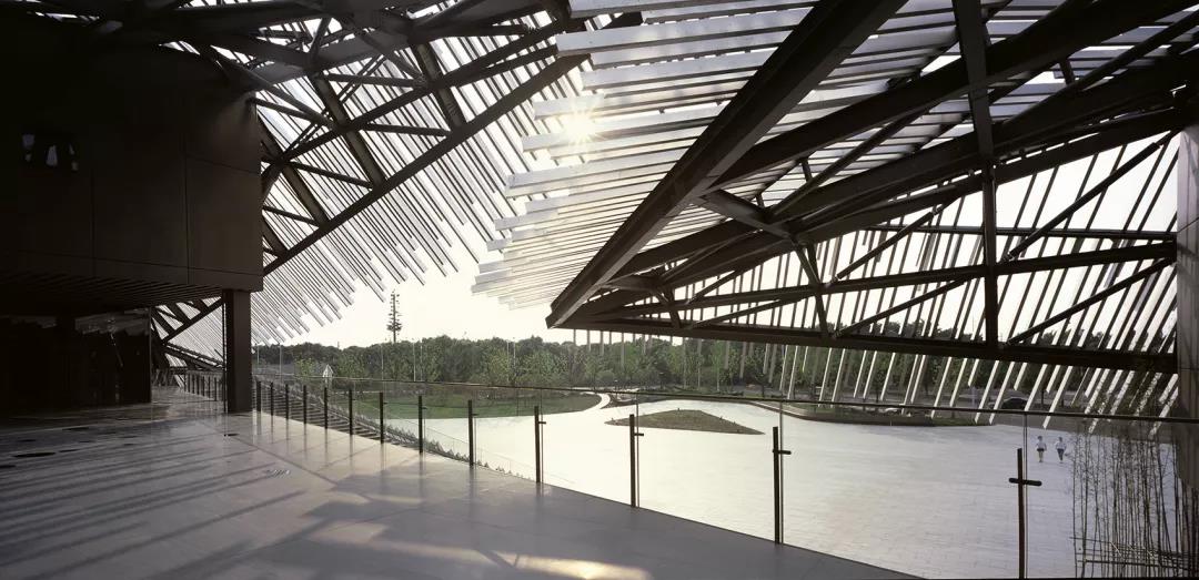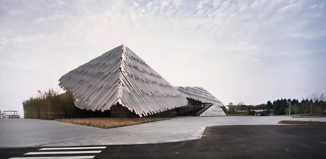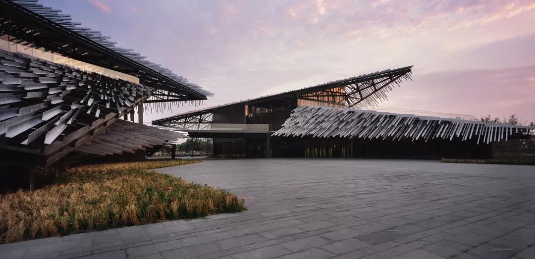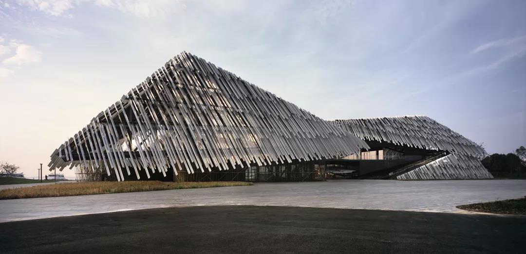該項目位于蘇州相城區,是陽澄湖的港口碼頭和游客集散中心。設計的目標是通過對尺寸相同的擠壓鋁材部件的隨機放置,來構建一個巨大的、形似山丘的地貌形態結構。