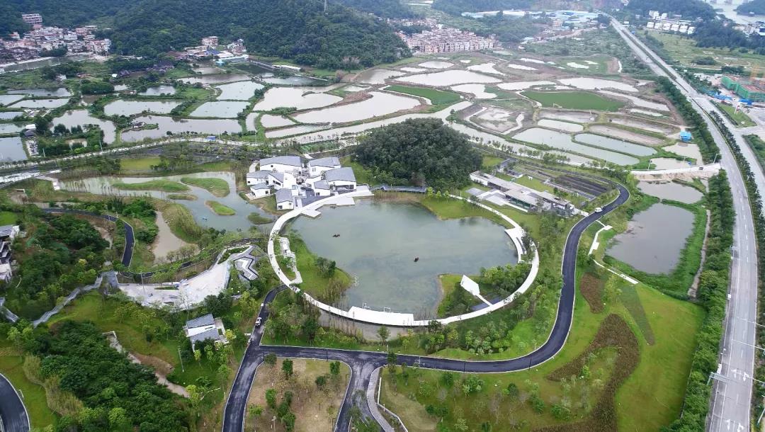 (3)新設計的濕地浮島,也完全尊重歷史水系肌理,選址原有魚塘的位置而設計。流經場地的原有河涌和截洪溝被保留美化,保證外圍村莊的泄洪需要的同時,并維持原生態特色。