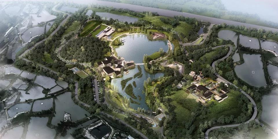 (2) 場地里最大的池塘被完整保留,場地外圍的桑基魚塘也最大程度的納入視線之內。選定中間一些水塘集中的區域設計出的中心水體,成為承載整個景觀的核心,再通過一個圓環,連接起不同的景觀節點。