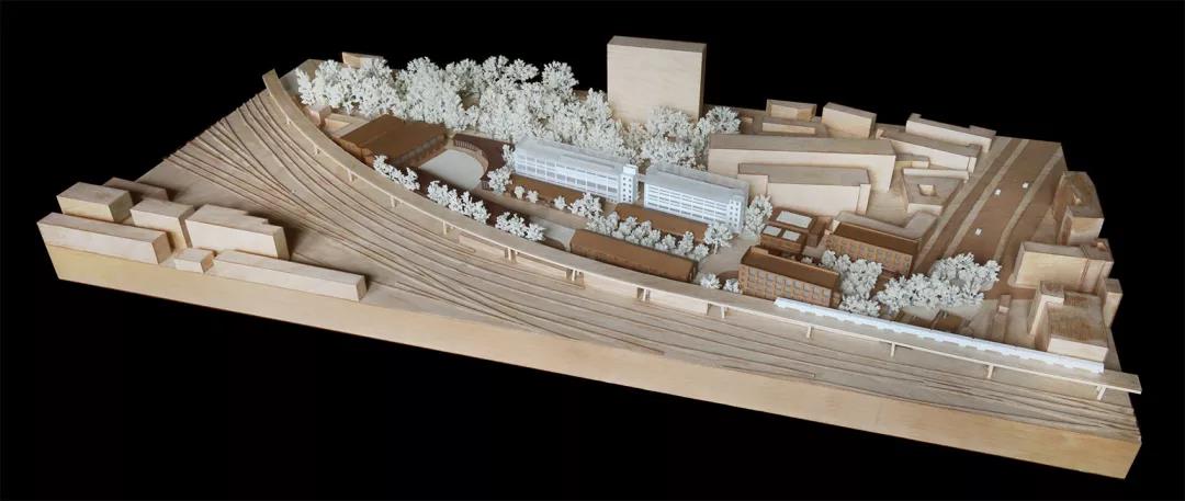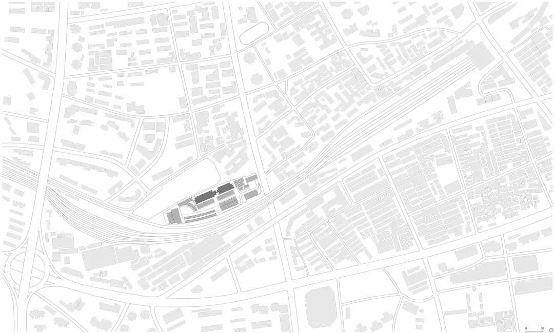 項目位于上海市區,緊貼輕軌,高架線路的弧線限定出了地塊的南部邊界。整個地塊都暴露在周期明確的鐵軌聲中。地塊北界也是一道弧線,圍墻外就是公園,園內大樹繁茂。從上面看,整個園區呈梭形,東邊是唯一的入口。