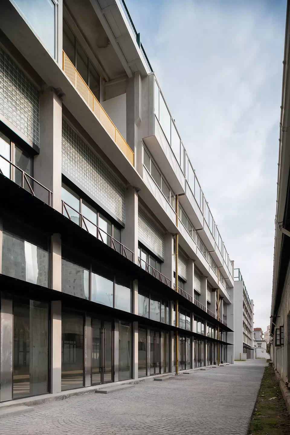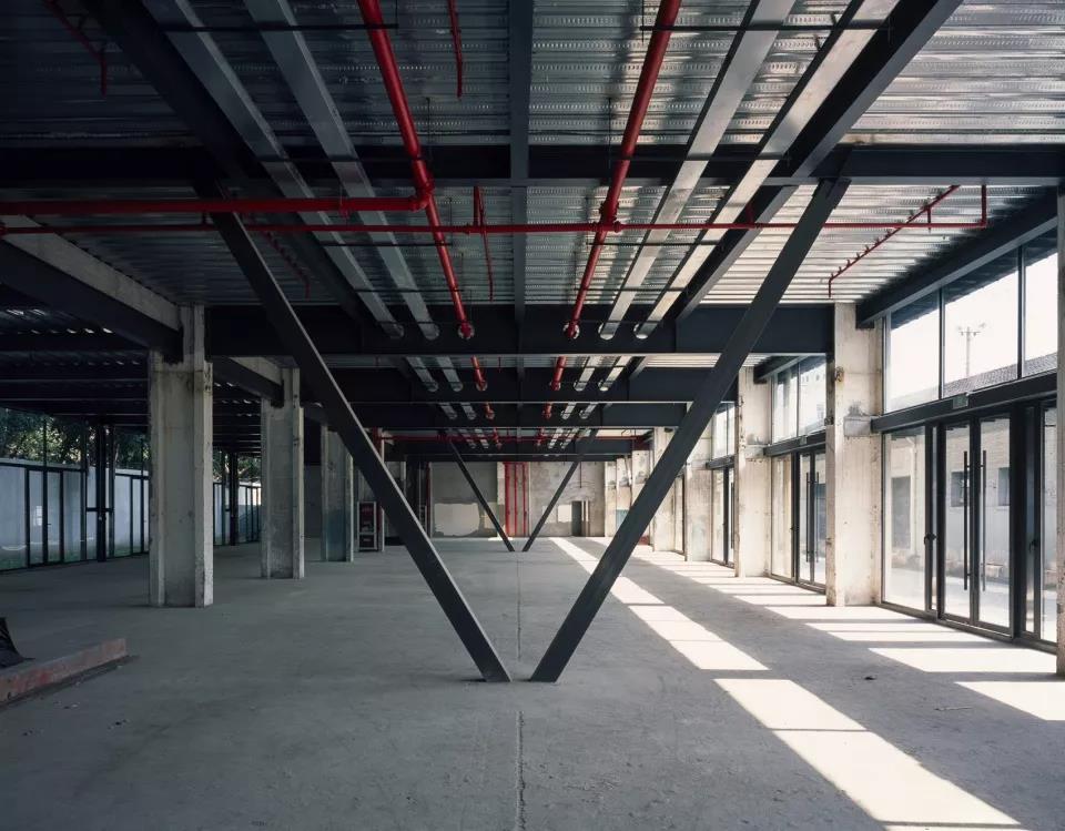 4號樓和5號樓是混凝土預制框架結構,雖然從立面看起來都有五層樓那么高,但實際上4號樓是三層建筑,5號樓只有兩層。業主原打算直接在里面加上隔斷,形成一間間小辦公室,但這意味著有些辦公室有6米的層高,卻只有3米的面寬。我們建議做插層,把兩個庫房都變成了四層建筑。這帶來了一些結構上的挑戰,有很多問題需要解決。