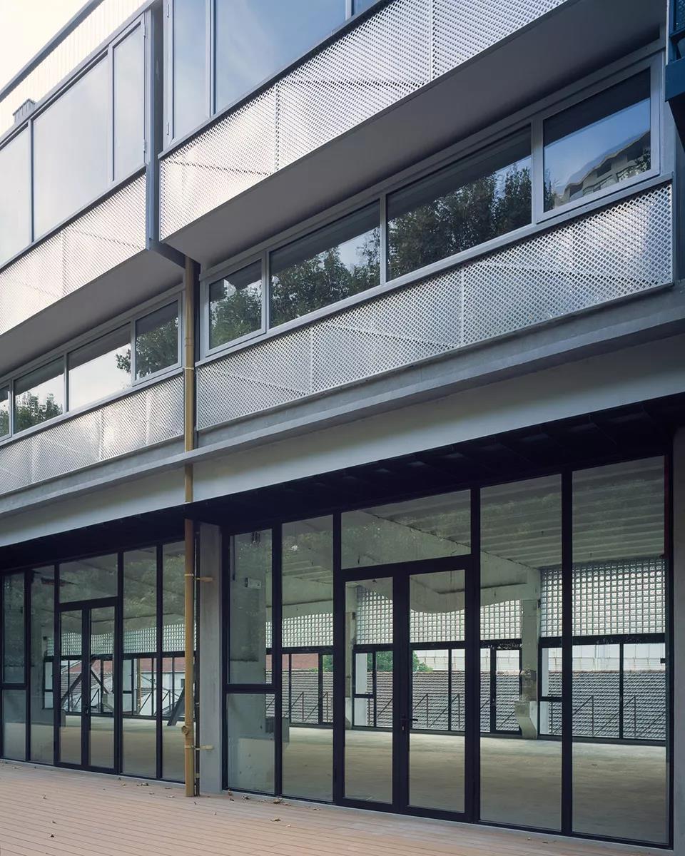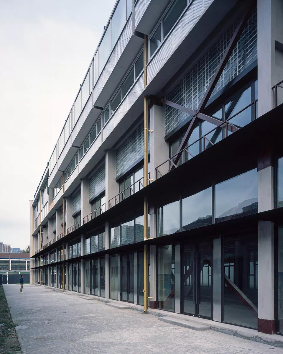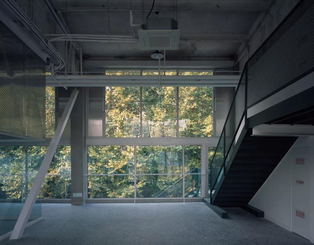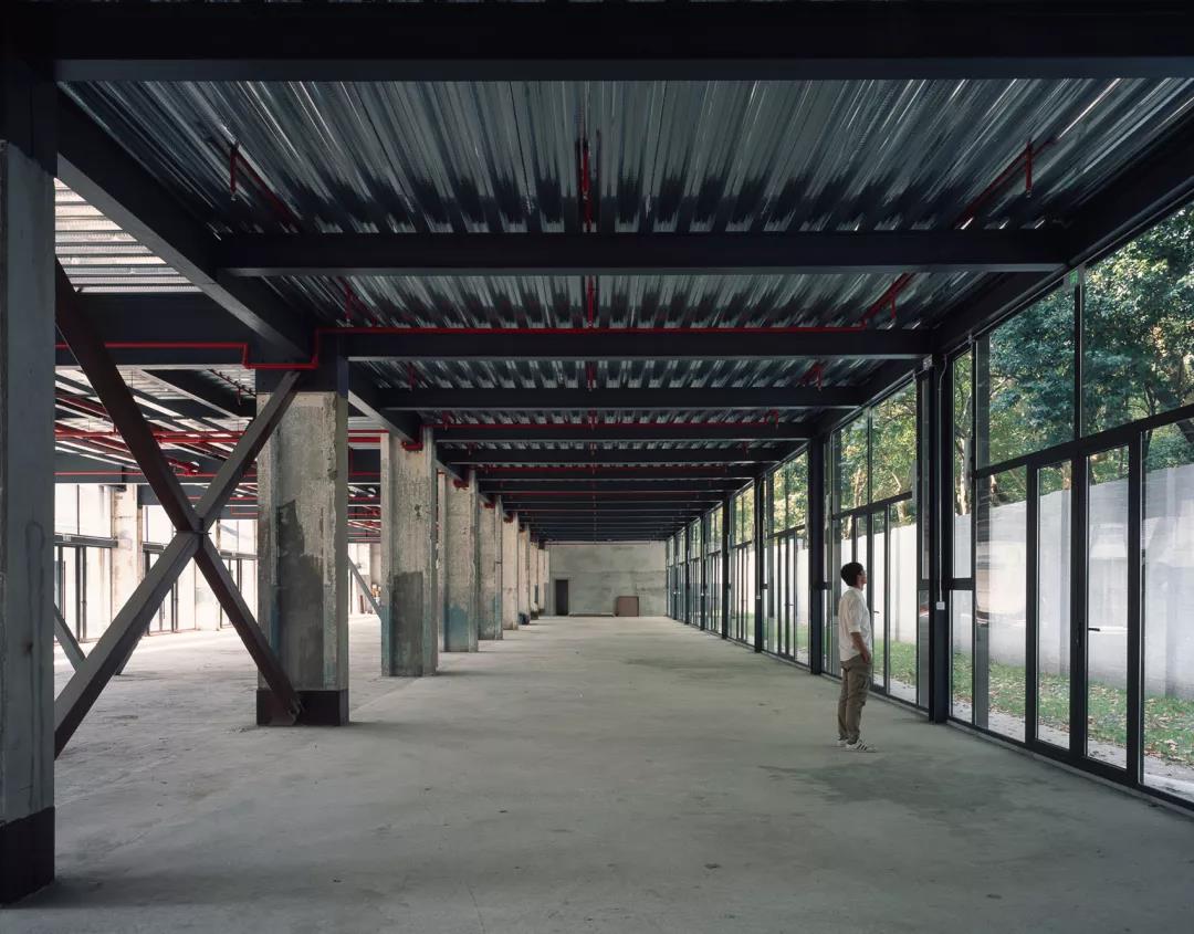 建筑的立面變動明顯,一是源于內部空間的巨大變化,二是結構加固的需要,原來的倉庫為單跨結構,不滿足現行的結構規范要求,通過跟結構師反復討論,評估了性能、造價和使用功能之后,確定了最終的加固方案和新加斜撐的具體位置。由于內部功能的劇變,原有的建筑外墻都不可用,新的外墻對應著新的內部空間劃分,我們使用了一種輕盈的語言,強調了建筑的舊框架,在里面添補新的秩序,如同Eames夫婦設計的組合柜,在一個簡單框架里容納了多種語匯,實的、透明的、空的、孔洞、斜線、反射的……好像在零敲碎打的回應問題,但最后也呈現出了一種輕松明了的整體感。