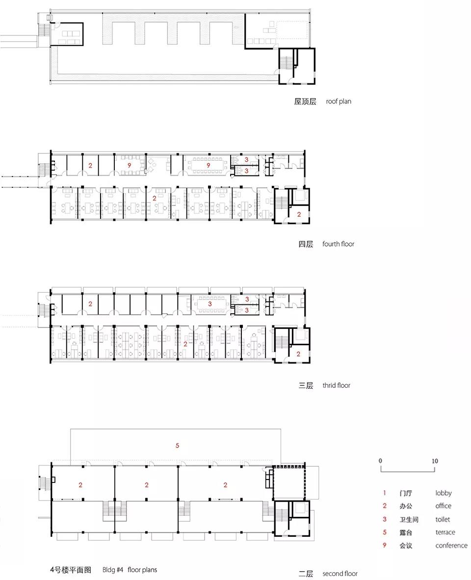 地塊中分布著不同時期多種類型的建筑,有辦公樓也有倉庫,體量與結構類型差異很大。場地內部缺乏秩序,一直被當做一個大停車場,供周邊的辦公區使用。現狀的外部場地和建筑都沒有被有效的利用,業主希望我們重新規劃整個園區,并改造每個建筑。由于工程復雜,需要分三期進行,第一期的任務就是將4號樓和5號樓改造成辦公樓,業主想把自己的辦公從離鐵路最近的1號樓遷移至其中。