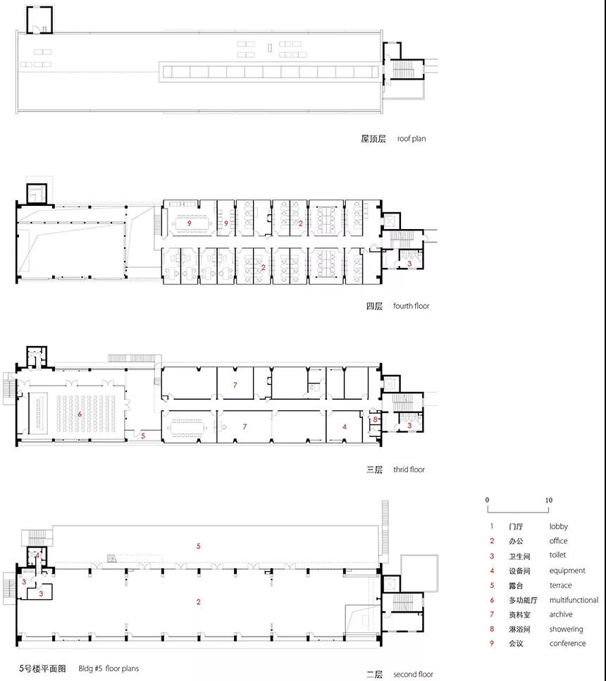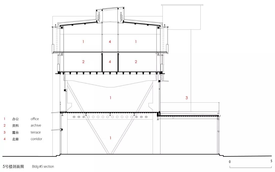 5號樓原為兩層,底層層高9.9米,第二層層高5.7米。我們將底層分割成5.3米和4.6米兩層,供租賃使用。二層東邊的6跨,在局部做了插層,下層層高2.3米,用作資料檔案庫,上面用作辦公室。西邊4跨保持原來的層高,作為一個完整的大空間,供會議和活動使用。為了達到任務書規定的獨立小間辦公的面積要求,插層的樓板做了出挑,立面上呈現為一個個突出的盒子。站在插層高度,離原來的大梁很近,為了減輕大梁的壓抑感,我們把內廊向上延伸,并把頂部做成天窗,所有需要在樓內環通的設備管線也整合進了這個天窗的側壁。