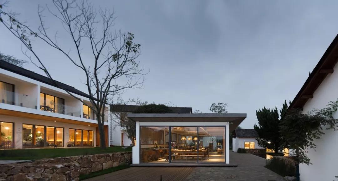 客廳這組前院建筑后方是后院,后院保留了一棟二層磚混結(jié)構(gòu)舊房屋,只是簡單修復改造,對屋頂進行了翻新,對窗戶調(diào)整了位置大小,以適應(yīng)居住需求,一樓做兩間員工宿舍和布草辦公,二樓改出兩個套間。后院另外新建了一棟二層客房,一層是整個民宿的廚房和餐廳,二層是標間客房,面積較小較緊湊,利用空間高度做了5間帶局部夾層的家庭房。再往后院東側(cè),是一組庫房圍合的小院,同樣的改造原則,原址改造了四套客房。風格保持傳統(tǒng)的坡屋頂木結(jié)構(gòu)建筑。這樣布局最后出現(xiàn)了三組院落,提供了較多的景觀和活動場地。