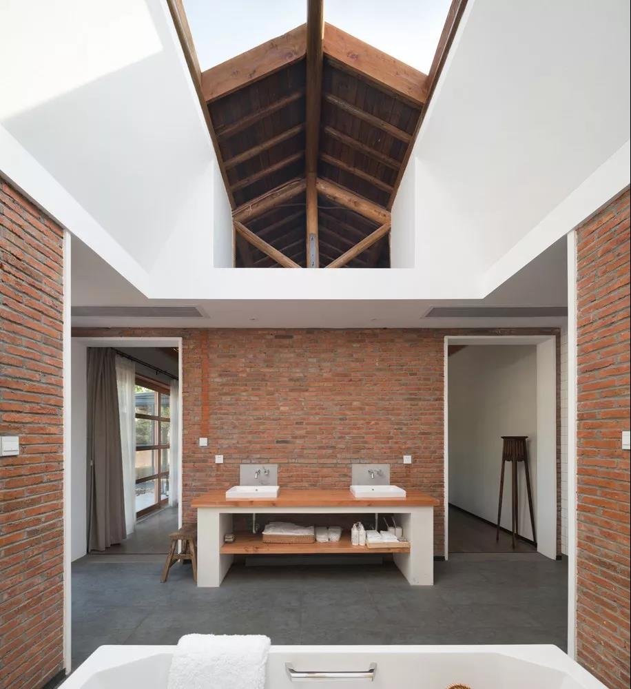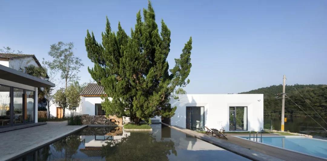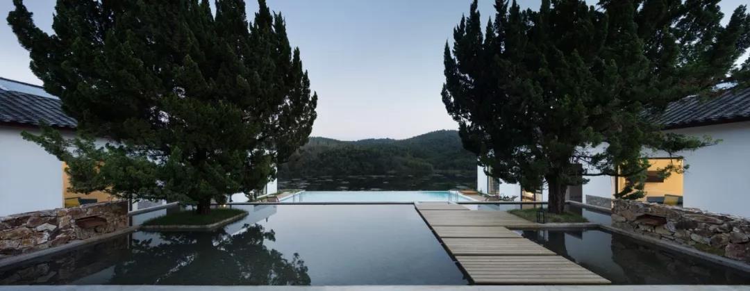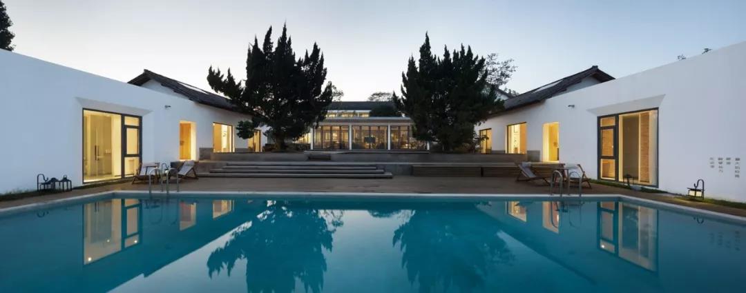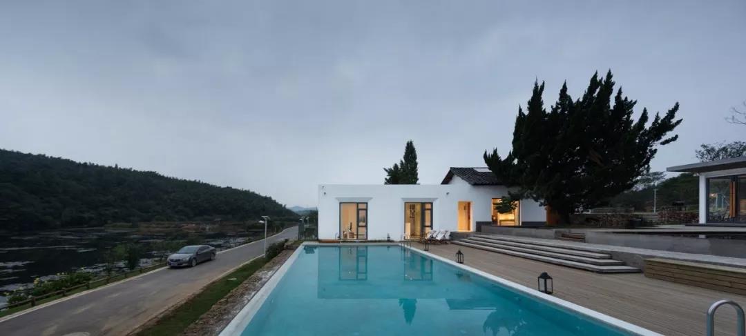 兩側(cè)廂房:客廳前兩側(cè)廂房保留下來,改造為兩間客房,每間約40平米,做成小套間,屋頂更換青瓦,加了保溫層,內(nèi)部沿用以往的木結(jié)構(gòu)屋架。廂房往前各自再加一段一層平屋頂建筑,作為兩間臨湖客房,面積戶型與廂房相似。這樣就保留了原來合院的正房廂房格局,并且強化空間圍合,地面對湖面跌落處理,保持客廳能看到更多湖面。圍合部分保留了兩顆原有柏樹,另外增加了一個小型泳池。泳池對于城市近郊民宿尤其重要,一是可以增加夏天暑假的對小孩的吸引力,另一是住店客人中家庭和團建占比很大,泳池是一個很好的游戲和活動的設(shè)施。
