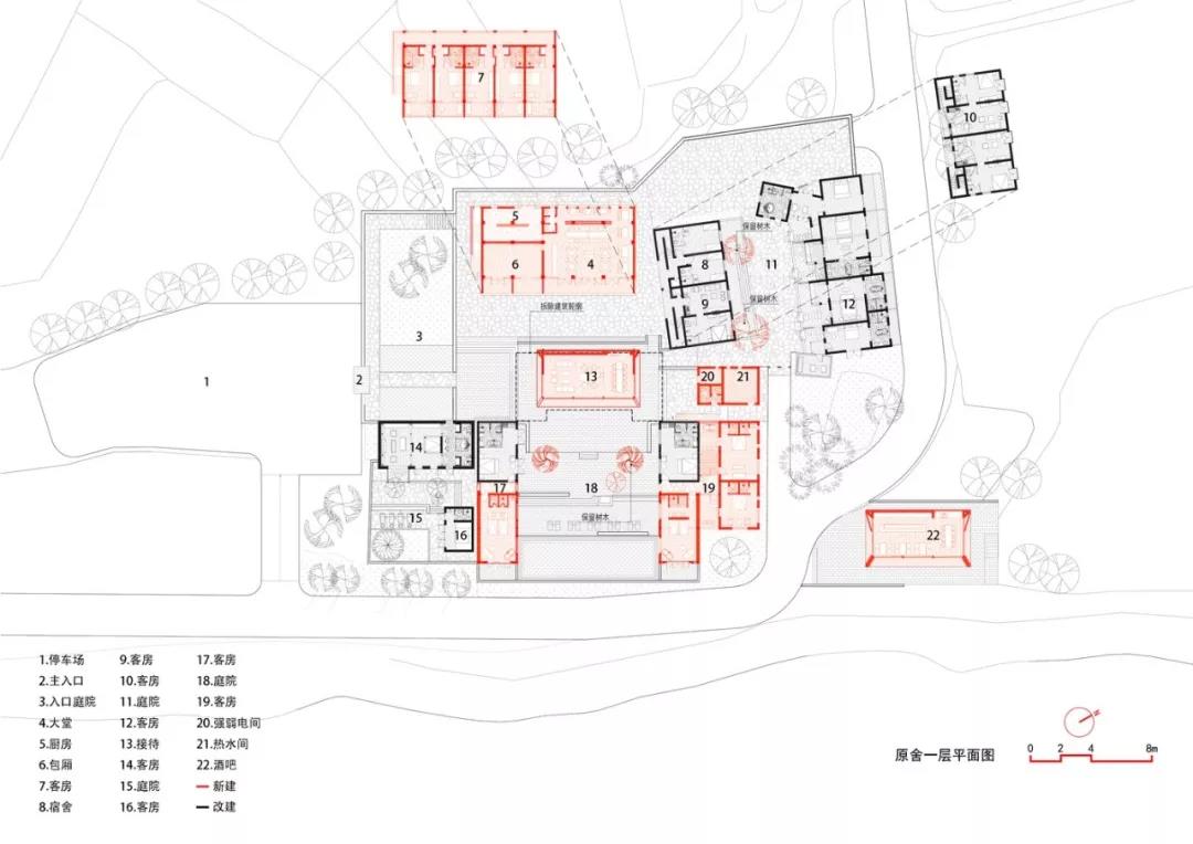 改造策略可總結(jié)為“四原”方針:即保持“原址、原尺度、原地貌、原材質(zhì)”,進行重建。西側(cè)原來紅磚側(cè)院保留,重建一組帶院子的套房;正房部分改為接待廳,坡屋頂廂房前增加一組白色平屋頂房間;正房后方新建一棟二層白色坡屋頂客房,一樓餐廳廚房,二樓客房。客廳后原有二層住宅保留,改造為客房;二層東側(cè)原有輔助房屋原樣修復,改造出4間套房。