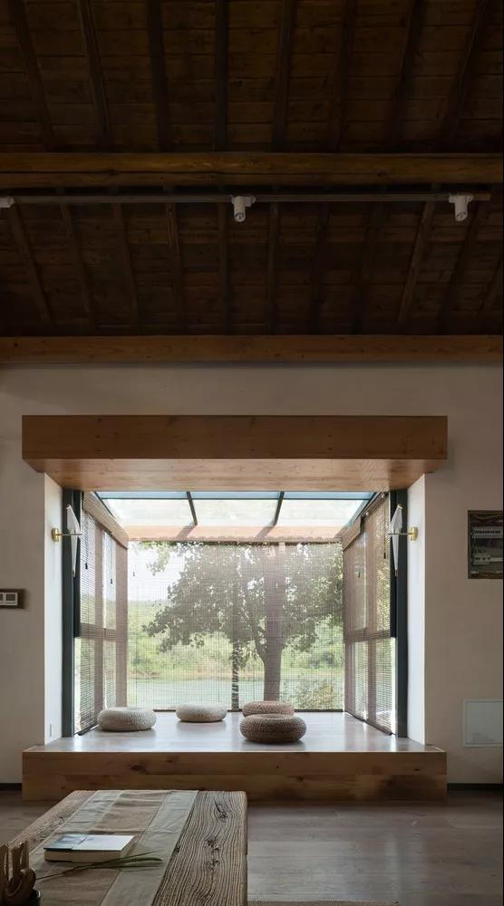 進入原舍,首先是主入口部分:將原來主入口調(diào)整至西側(cè),原來面對湖水的入口則留作適宜停留休息的內(nèi)部景觀空間,這個位置后來增加了游泳池。