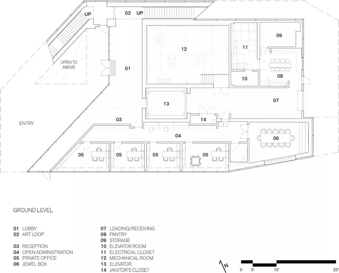 二層平面圖:內部空間設計為環形結構,大廳樓梯引導人們抵達二層俯瞰Chris公園的窗邊