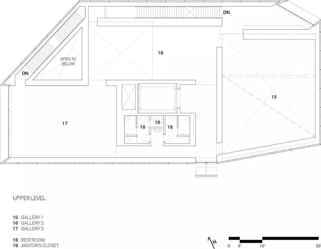 參觀者從俯瞰Chris公園的窗邊穿過三個展覽空間,每個空間內部都有一個朝向不同的采光塔,將圣安東尼奧耀眼的陽光調整過濾為內部柔和的光線。在經過最后一間展室向下回到大廳之前,參觀者能夠在這個區域看到整個入口廣場和San Pedro河,從大廳可以到達建筑南側的室外雕塑花園。