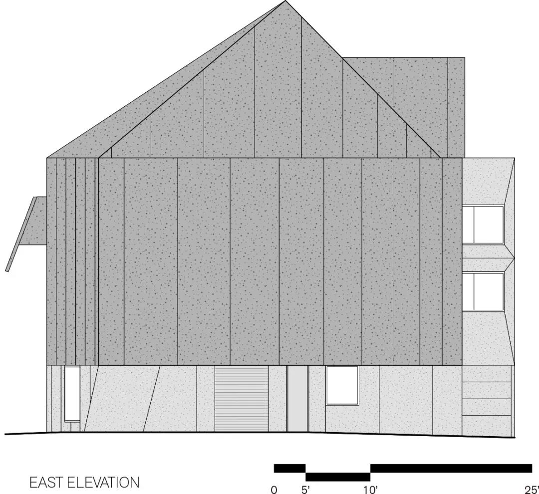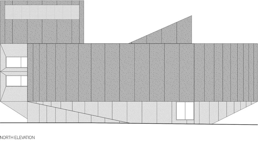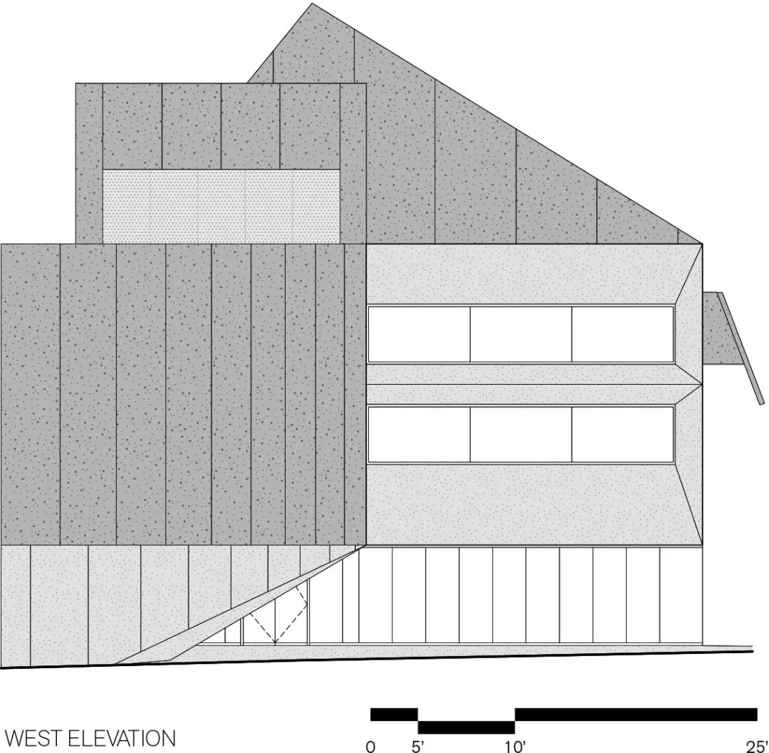這種光滑與粗糙構成了Ruby City標志性的特征?!焙裰亍暗恼劬€形斜屋面賦予了建筑別具一格的外觀造型,同時強調了向上的態勢。屋頂的兩扇天窗抑或叫做采光塔,形成了動態的屋頂輪廓線。