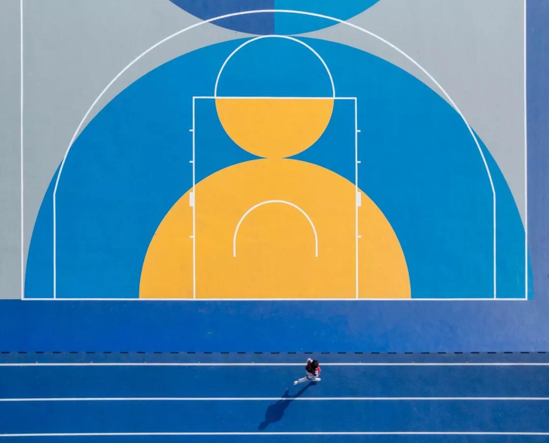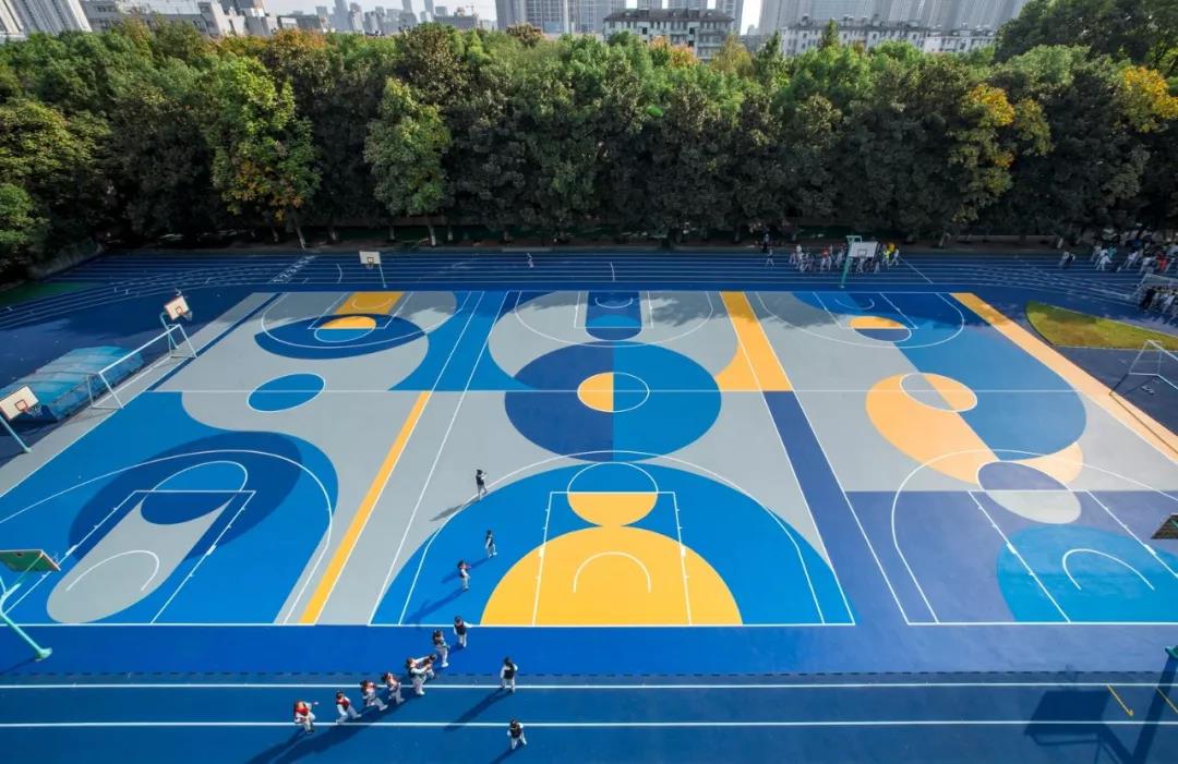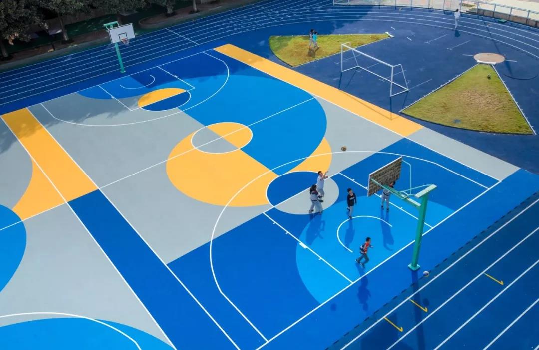 運動場地上改變了普遍單調的操場的涂裝規則,保持操場標線功能的同時提取其中固有的規律性元素進行圖形化延展處理,將對比的色彩植入其中形成強烈的“碰撞”,讓孩子們在運動中感受競技體育的樂趣。