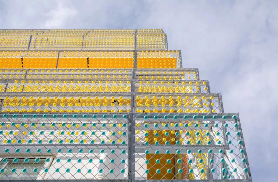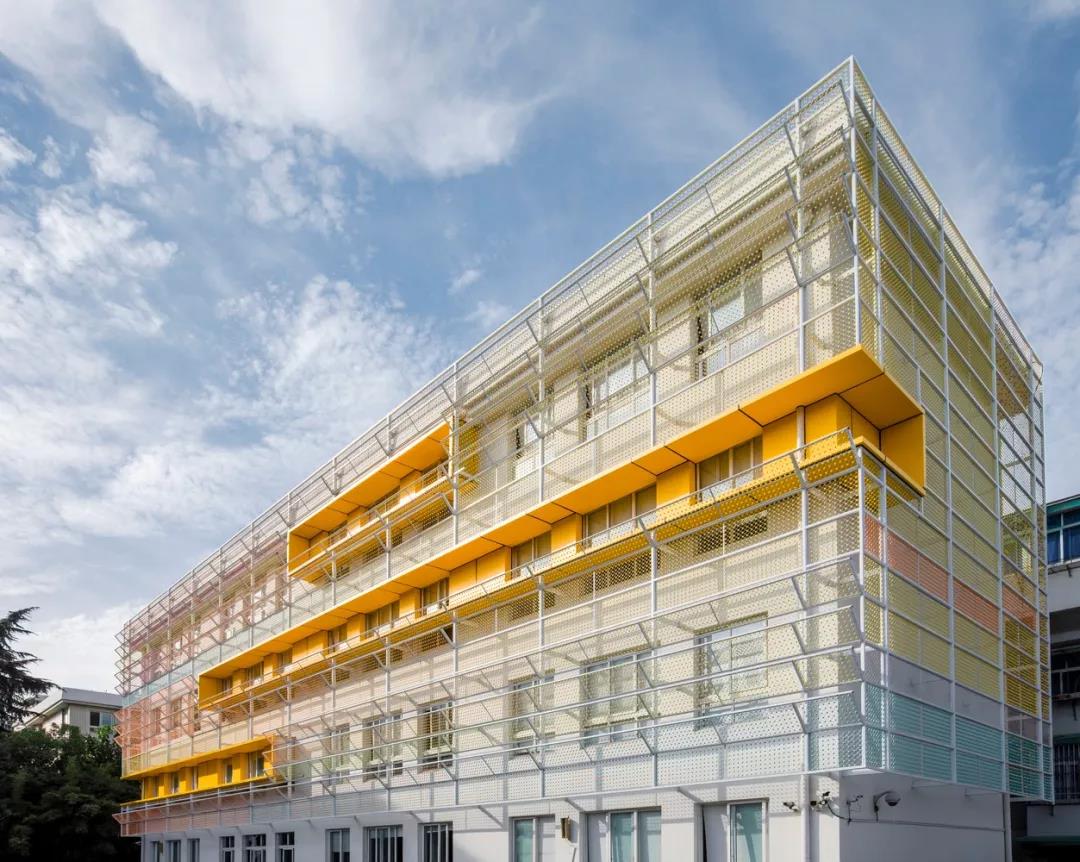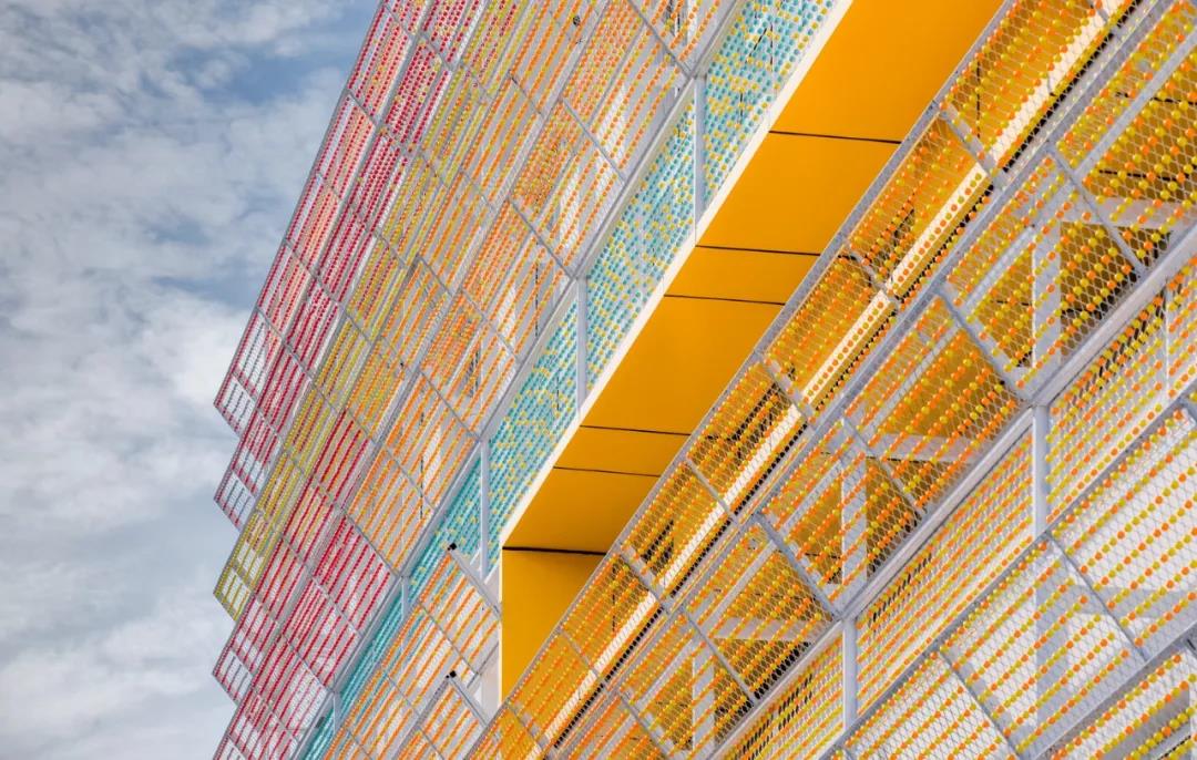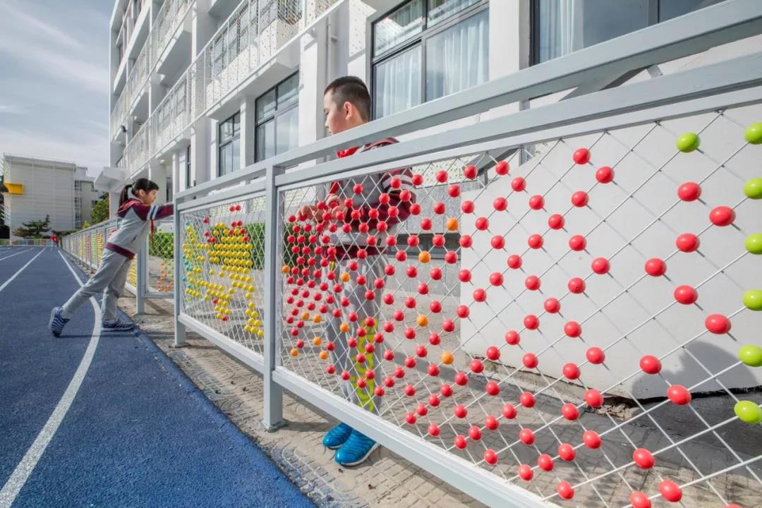 從建筑立面到學校操場地面,從暖色逐漸往冷色沉淀,通過建筑外墻構架形成建筑機理,一個個彩色的“糖果球”被賦予到空間中去,各種組合與搭配產生不同的色彩變化,營造出層次豐富細節生動的趣味。使整體立面設計輕盈透亮,色彩在遠處自然暈染散開。