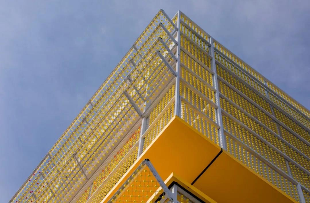 球體所附屬的網狀構筑物與建筑立面呈四十五度夾角關系,既不對教室的光亮造成影響,在視覺層面上又會呈現色彩的交織、融合、疊加、分解的動態視覺感受,使人在空間運動過程中感受色彩的變化流動。這些球體相互連接又相互不同,好比全球互聯下的今天人們交織鏈接在一起。
