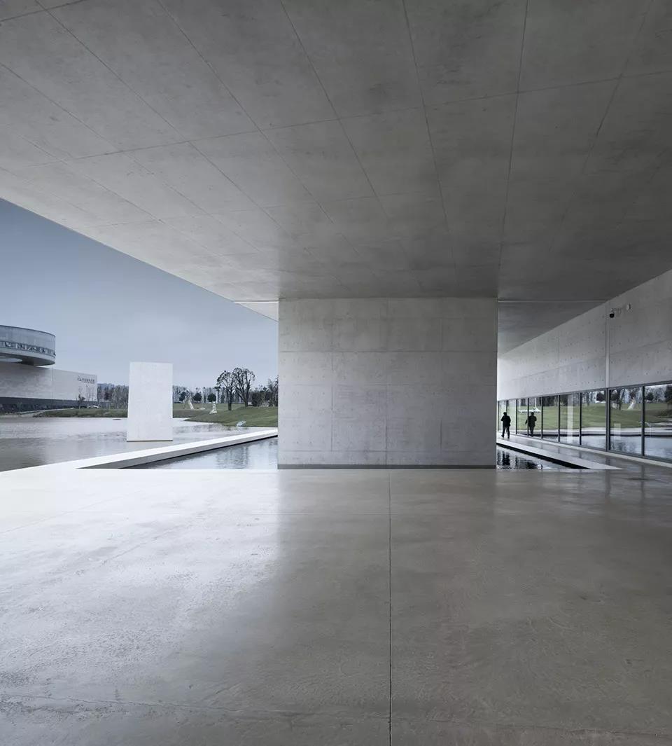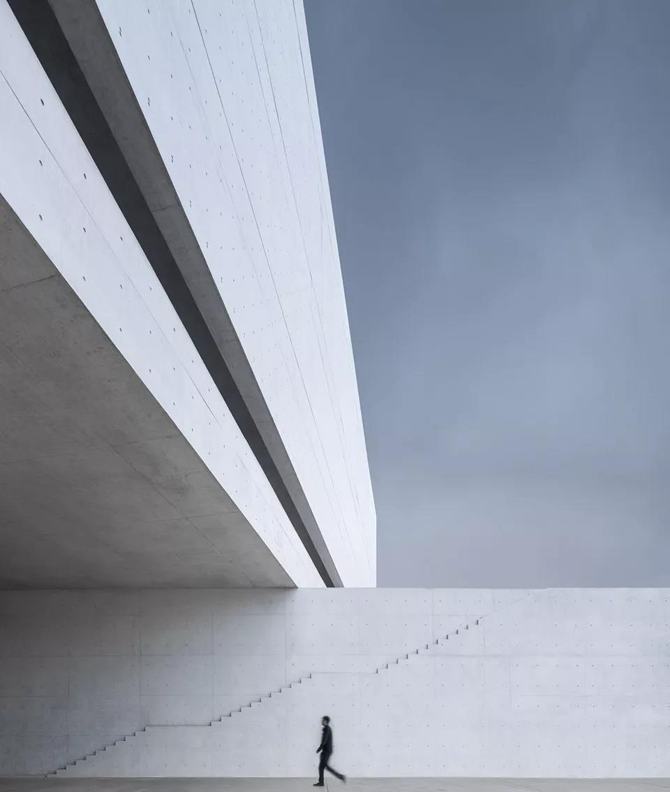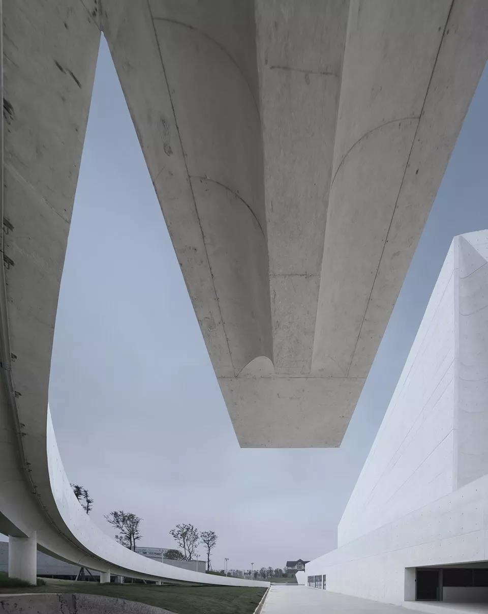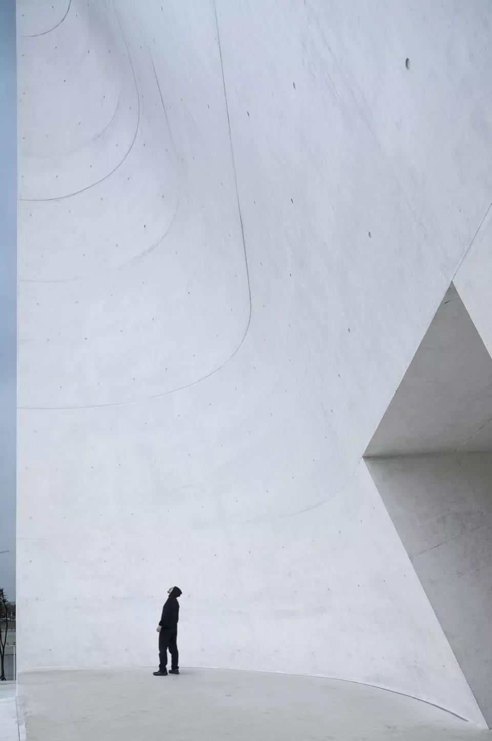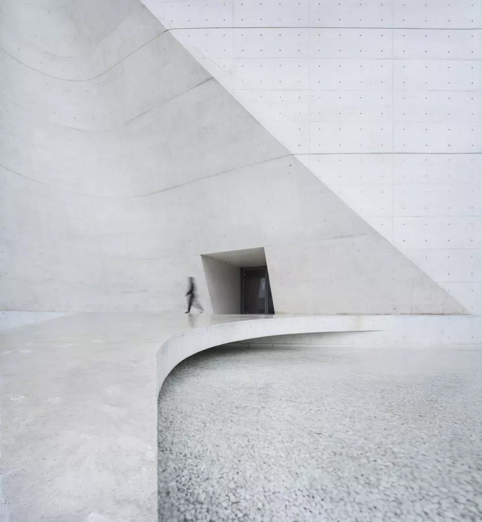 建筑主體由白色清水混凝土一次性現澆而成,無論墻體,頂棚、地面或室外廣場、平臺、棧道都只使用清水混凝土一種材料,做法本身就是超越性的。