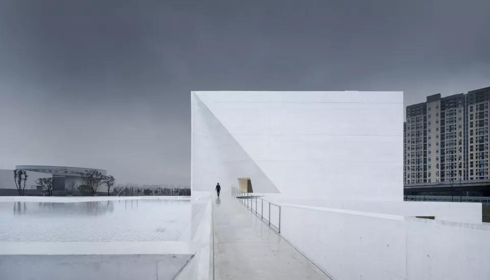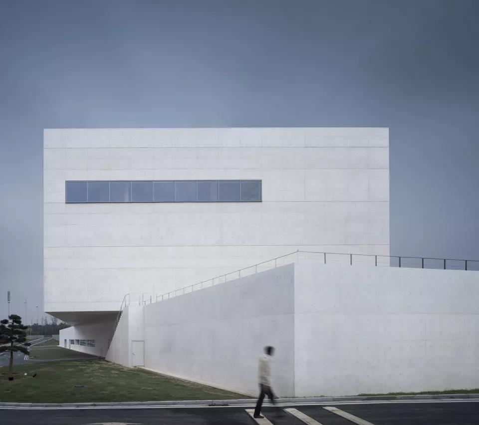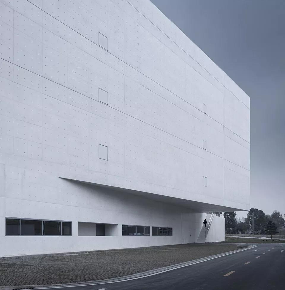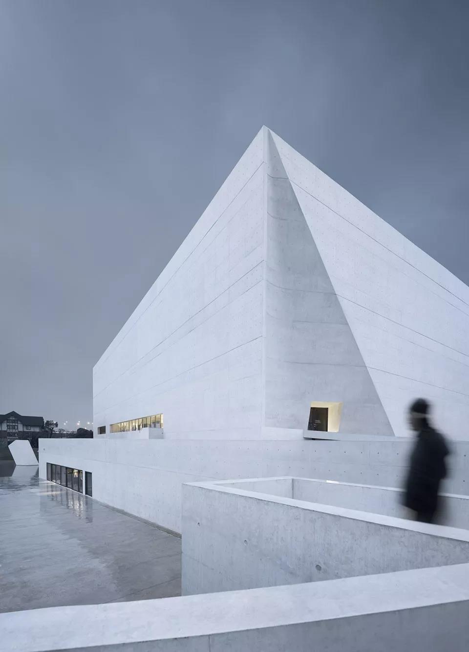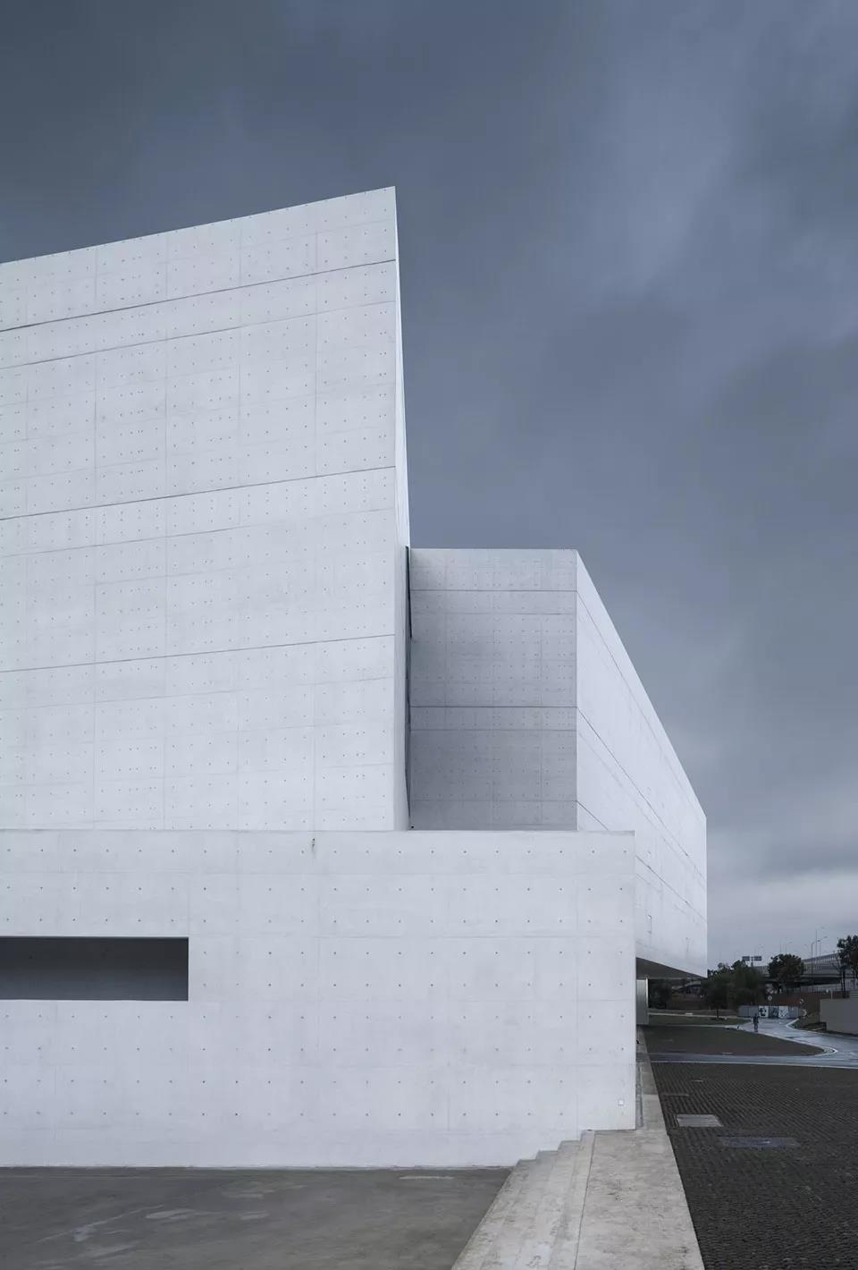 建筑主體由白色清水混凝土一次性現澆而成,無論墻體,頂棚、地面或室外廣場、平臺、棧道都只使用清水混凝土一種材料,做法本身就是超越性的。