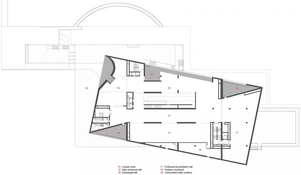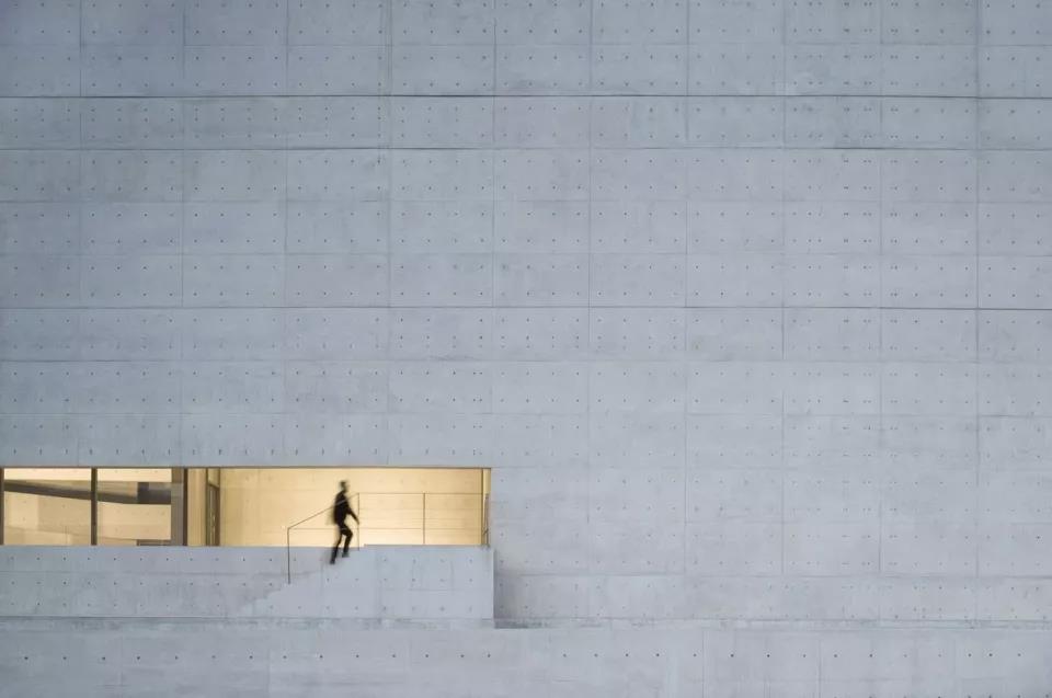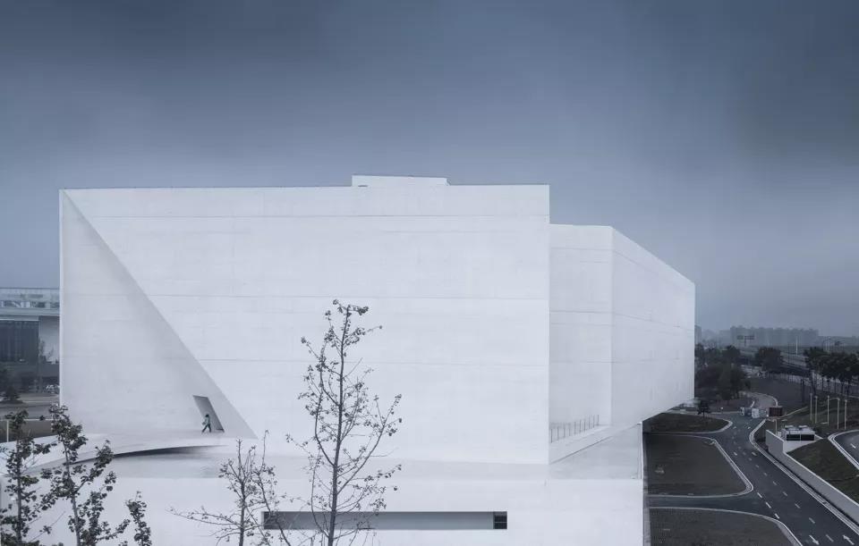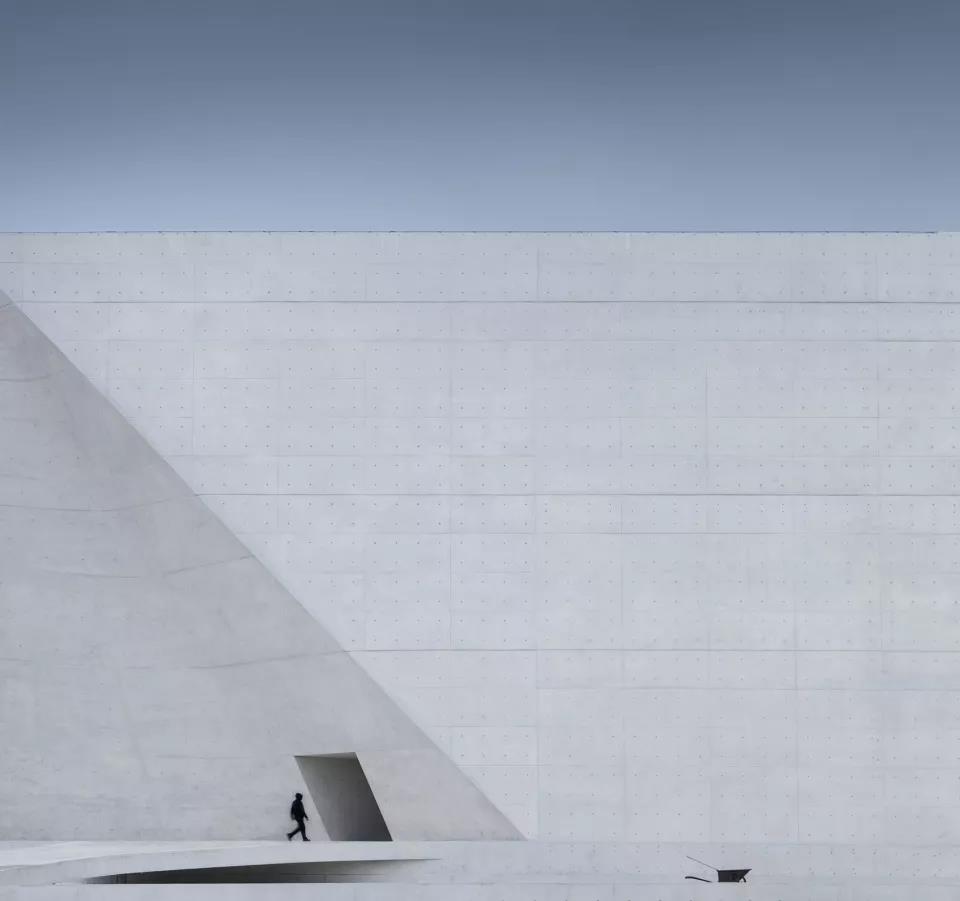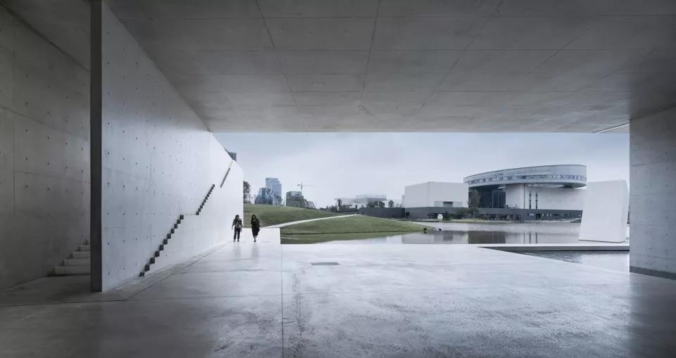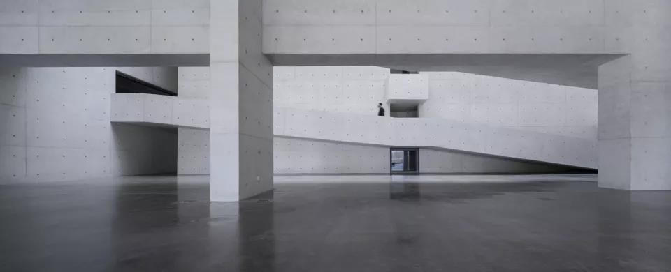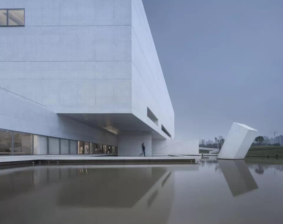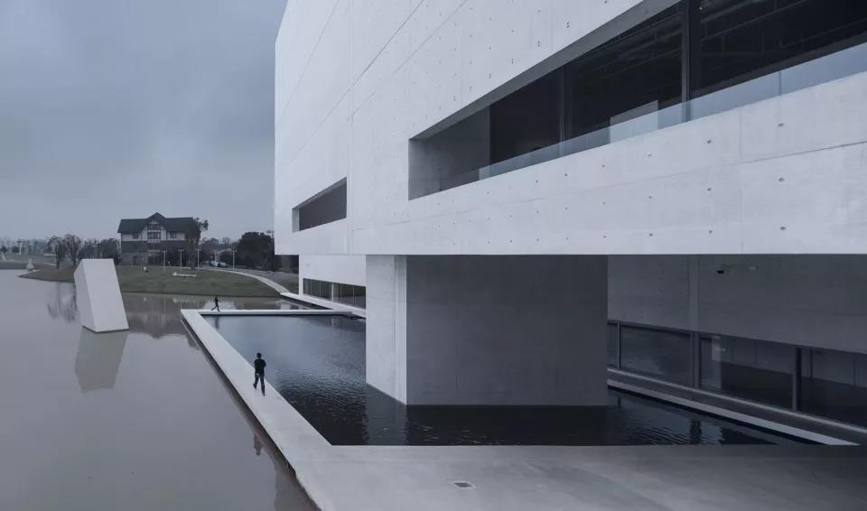 建筑主體由白色清水混凝土一次性現澆而成,無論墻體,頂棚、地面或室外廣場、平臺、棧道都只使用清水混凝土一種材料,做法本身就是超越性的。