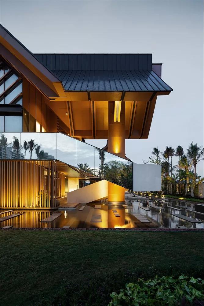 在建筑主體的材料使用上,我們選擇了與海南當(dāng)?shù)亟ㄖL(fēng)格呼應(yīng)的材料組合。屋頂和主體使用了木飾面材料,聆聽自然,走近生態(tài)海南;局部使用了白色和鏡面的金屬材料,提升現(xiàn)代工業(yè)美感的同時(shí),以簡(jiǎn)潔明亮的線條勾勒整體。另選用高透玻璃強(qiáng)化虛實(shí)對(duì)比和節(jié)奏變化,使建筑同時(shí)展現(xiàn)出明快、輕盈、自然和富有文化等藝術(shù)品質(zhì)。