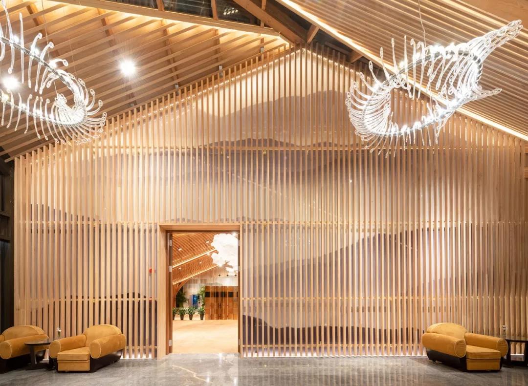 建筑室內裝飾也以木材為主要材料,通過木格柵疏密相間的設置,呈現出中國古代寫意山水畫的線條與肌理,隱喻了中國傳統中對寧靜、悠遠的自然環境的向往,及其所代表的“天人合一”的理念與暗含的智慧與品德。