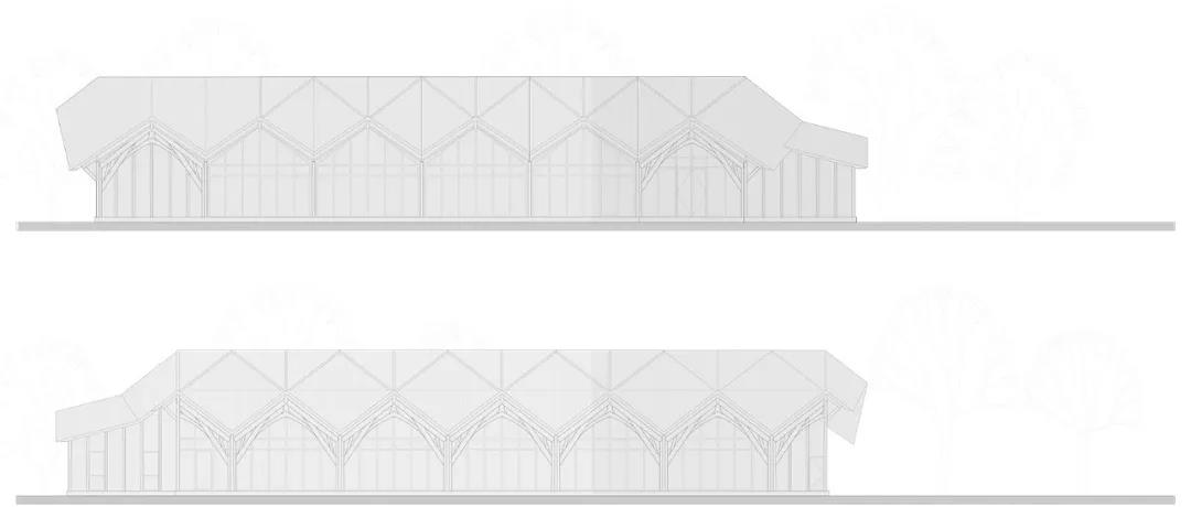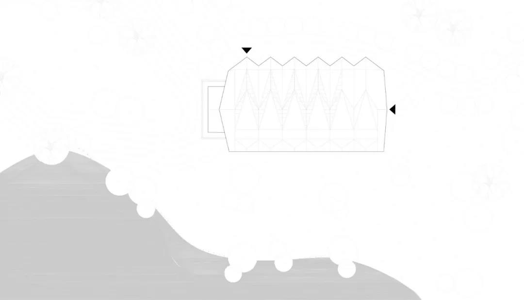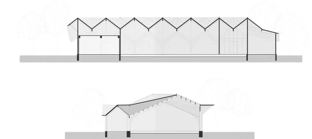 屋面采用折板形態,尺度相等的折板相互錯落拼合,幾何邏輯清晰、簡練,所形成的室內空間靈動且個性鮮明,兼具層次感與秩序感,同時又帶有傳統建筑質樸優雅的韻味。折板屋面頂部設置天窗,改善林間建筑幽暗的采光條件,當陽光從天窗照射下來,仿佛穿過樹木的枝葉投下重重光暈。
