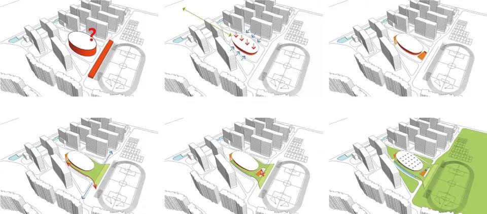 設計將重點定位在:量身訂制一座體育館–不對宿舍樓造成過于壓抑的影響,能成為整個校園的重要軸線收尾,并且能提供流線與造型均流暢便利的共享平臺,打造一座活力無限的校園魅力中心。