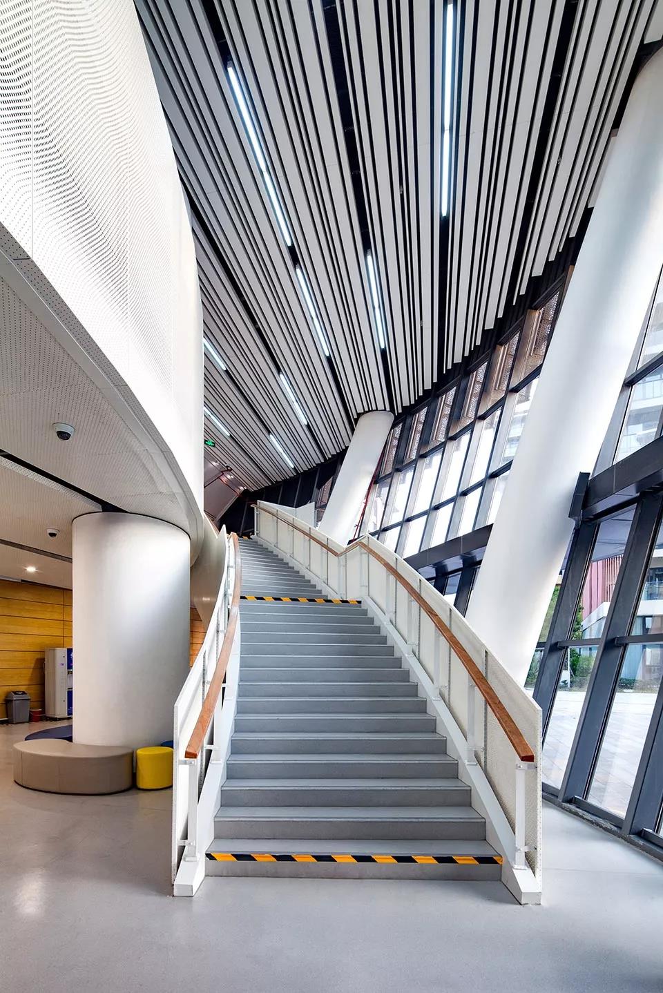 考慮到從校園不同角度的觀賞需求,立面裝飾材料主要采用玻璃幕墻、穿孔鋁板、埃特板與清水混凝土。其中穿孔鋁板構圖采用優美舒緩的波浪形,在入口處上翻,增加玻璃幕墻的比例,加強主入口的吸引力與引導里,而兩側坡道下方采用木色埃特板,打造富有親和力的基座。
