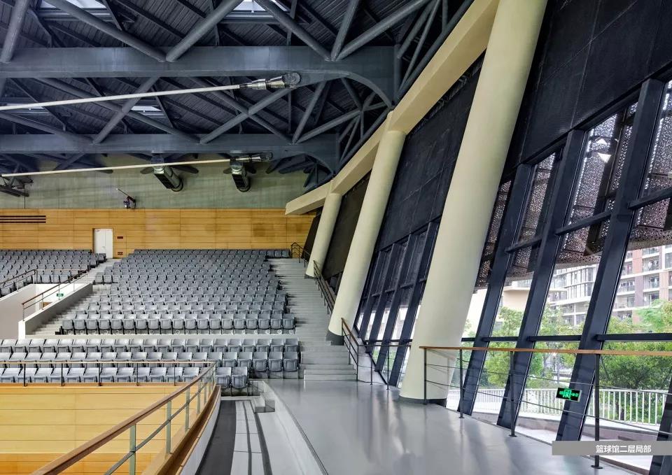 賽時為一片籃球場地,長邊呈南北向布置,座位主要位于東西兩側,其中西側布置2層看臺及活動看臺,東側布置主席臺為主,整個座位的傾向布局,是為整個學校的開學典禮提供合適條件,同時也與造型坡度完全契合。