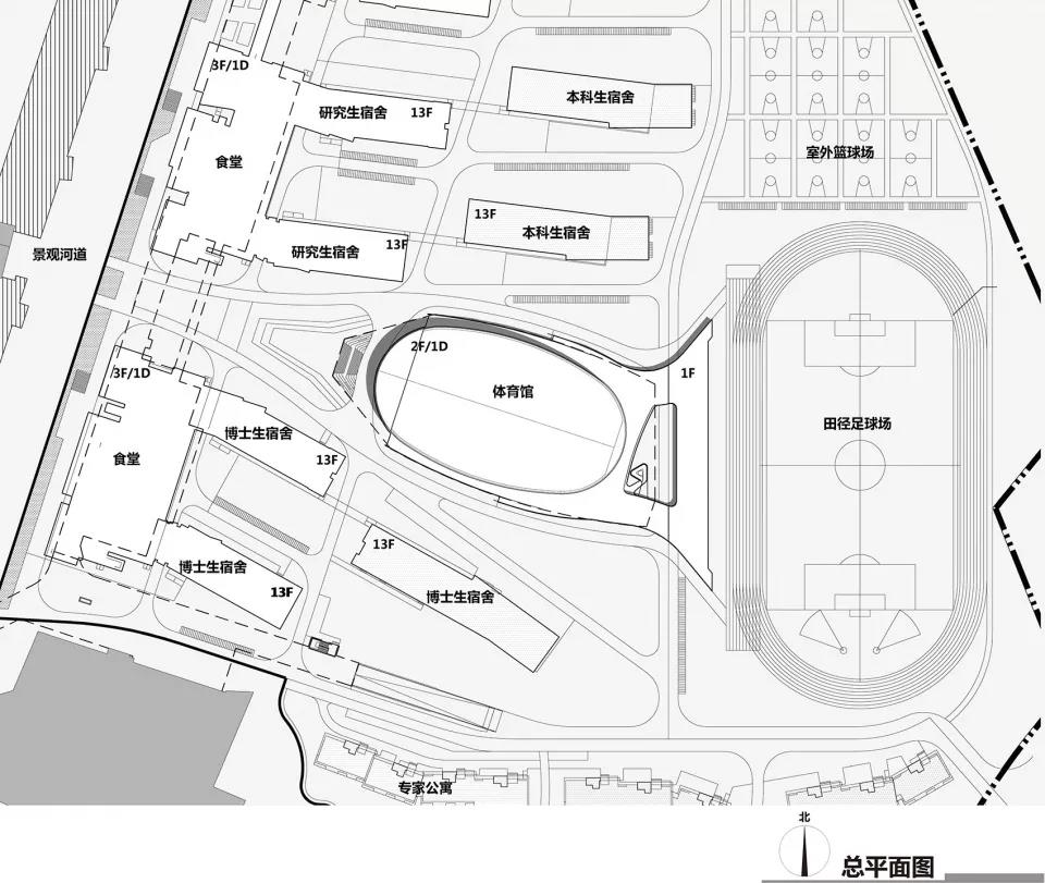 構成——規劃要求體育館為圓形構圖,周邊宿舍樓群如漣漪般波浪展開;同時體育館東側的田徑足球場,需要配置一座體育場看臺,因此形成了一點一線的布局,中間有校園主環路穿越,阻隔了2片運動區域的聯系。