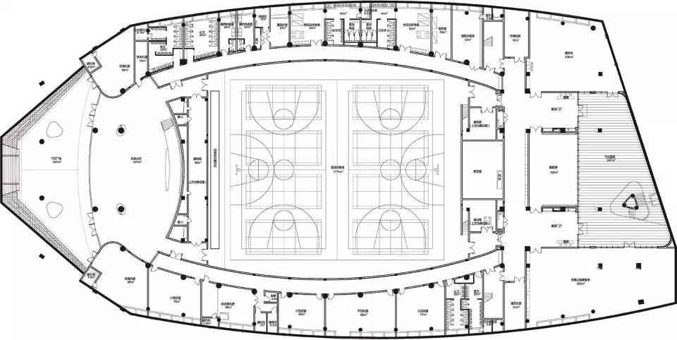 內部核心空間籃球館,位于建筑的橢圓形體量內