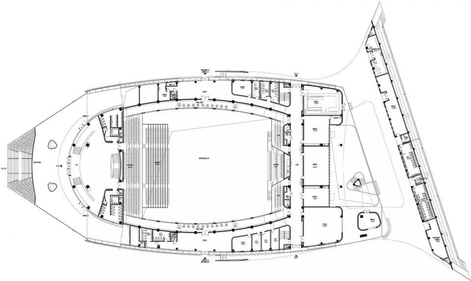 造型上借助地形與流線的特點,將整個平面設計成一尾舒展自由的魚尾形狀,尾巴端部就是體育場看臺