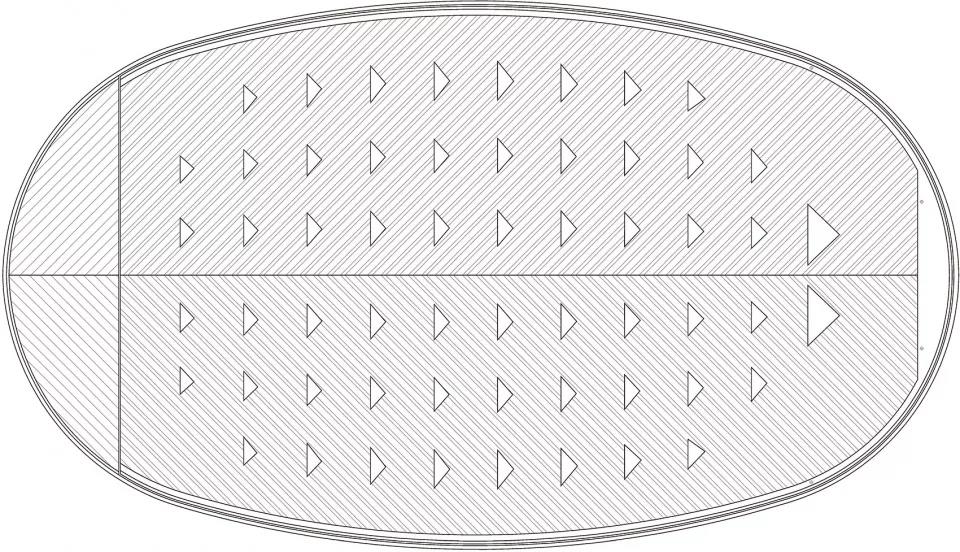 主體體量為一橢圓形體,呈倒錐型屋蓋由下向上變大,且屋頂西高東低