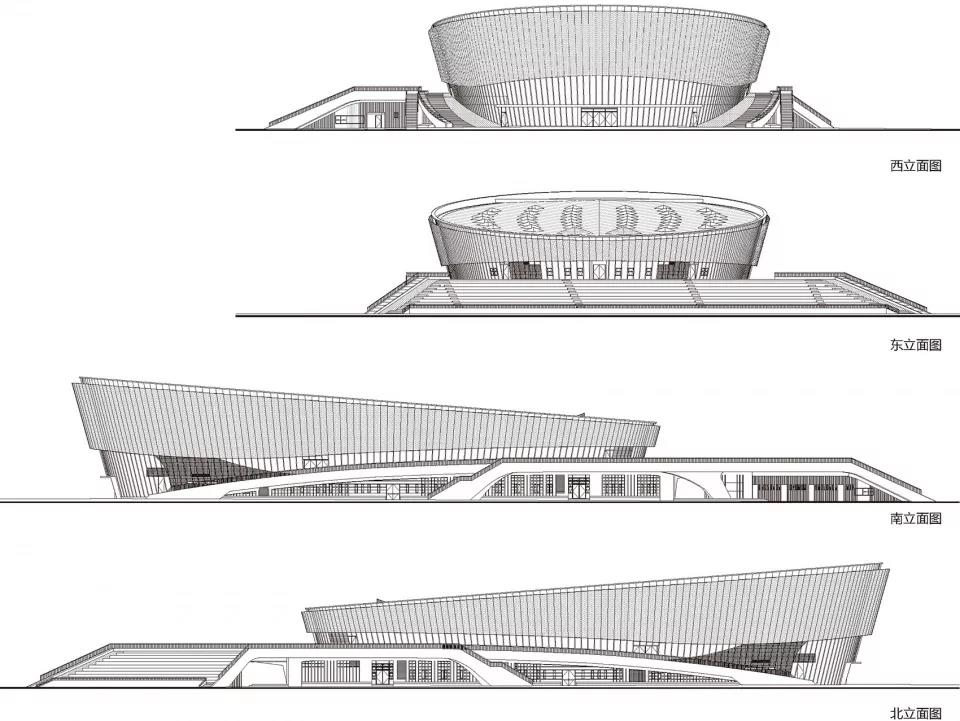 為了能在緊張的南北寬度限制中,盡量減少對兩側宿舍樓的壓迫感,因此建筑地埋一層,削減建筑高度;而坐席也采用東西長向布置,并著重布置在西側,增加樓座,如此既可以不占用南北寬度,又可以增加坐席數量,同時抬高西側高度,使建筑造型表里一致,契合功能需求的同時,巧妙的打造出西高東低的雙心橢圓形斜屋面,從而對西向軸線形成重要的對景立面。橢圓形體量下小上大,減少地面的占地,盡可能多得留給室外活動場所。
