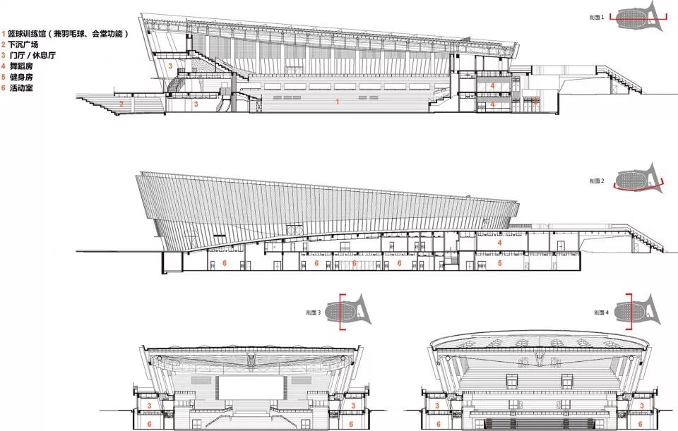 建筑兩側的輔助用房及其它活動用房,設置于地下一層與地面一層,并利用一層的屋頂,形成一條從地面到空中的緩坡平臺,平臺自然延伸,緩緩向東延展、打開,最終跨越校園道路直接連接至田徑足球場的看臺。在造型上,借助地形與流線的特點,將整個平面設計成一尾舒展自由的魚尾形狀,尾巴端部就是體育場看臺。