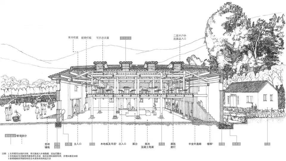 在這樣對自然敬畏和對自我克制的徽派哲學里,更新古村的最好方式,當然不是拆舊建新,更不是無節制的占地蓋房。我們嘗試將留存的隊屋,通過整修和適度的改造,重新服務于村里的現代生活,而不再是封塵于歷史、只能遠觀的老古董。此為“無建斯建”。