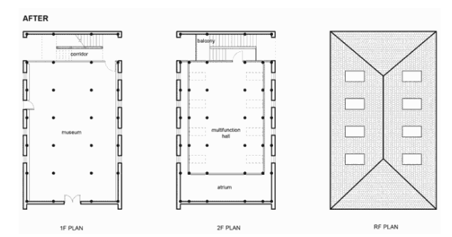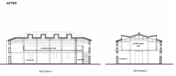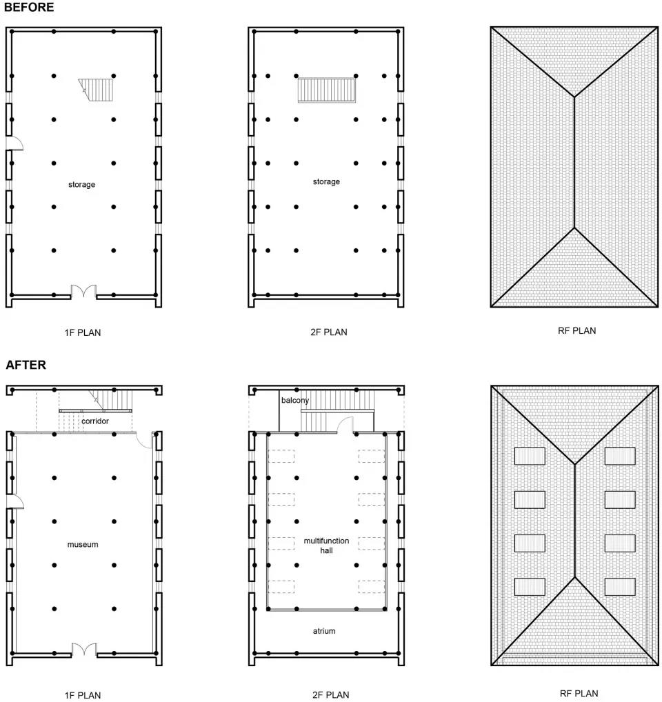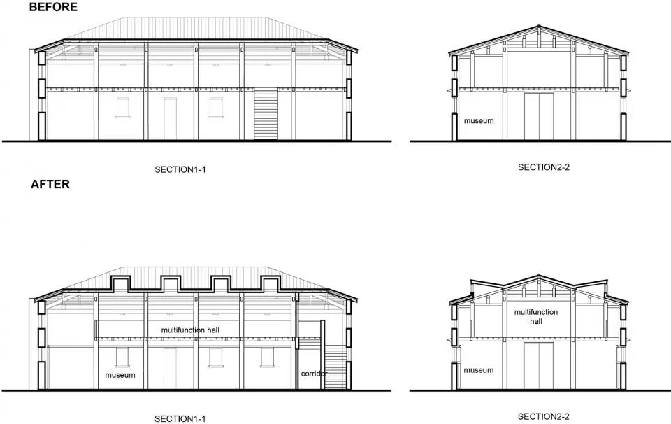 隊屋的原狀,是兩層滿鋪,樓梯解決在中部一個柱跨開間內,二層靠屋檐的末跨,凈高不足1.3m,幾乎無法使用。故改造中,將沿外墻的末跨打通為通高吹拔;最重要的改動,是將最端頭的一跨兩側實墻打通,去掉二層樓板,形成兩層通高的內街,再將樓梯置于此跨,把原來的室內空間變成公共穿行的內街。不僅增加了展廳與公眾的接觸面,讓人不進室內就能在內街里觀展,不進展廳就能用上二樓的公共空間。