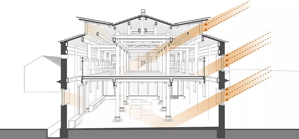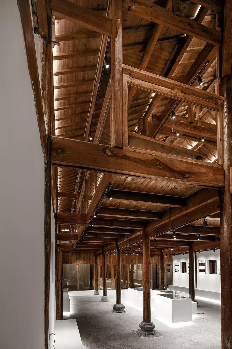 原主體木構架,柱子和大部分主梁保持得還算完好,只需將局部的腐朽和發霉部位打磨;椽子因為挨著瓦片,多數朽得厲害,故決定全邊更換。原建筑外墻上的窗洞很小, 有的甚至是磚頭大的通風孔, 考慮到安徽夏熱冬冷的氣候特征,在屋頂上對應的每個柱跨內增加了一個側高窗, 以加強室內四季的通風,尤其在春夏季,避免過度潮濕悶熱影響室內使用環境。