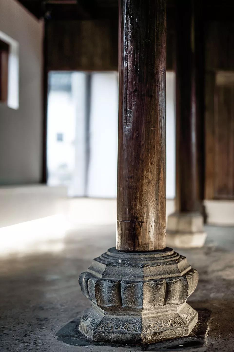隊屋曾經是奇峰村生產大隊的公共用房。室內有兩層:底層用于儲存農具、加工糧食,囤積材料;二層用來開會及勞作中途的休息。 現如今隨著農村的凋敝, 一層存放的農具顯然已久未使用, 倒是停了好些摩托車,成了臨時車庫, 二層也因年久失修漏雨而空置。但在雜物的間隙中,仍能看到木柱底部考究的石柱礎,也能在瓦片漏光的二樓,近距離觀察到木屋架中清晰的榫卯木作。