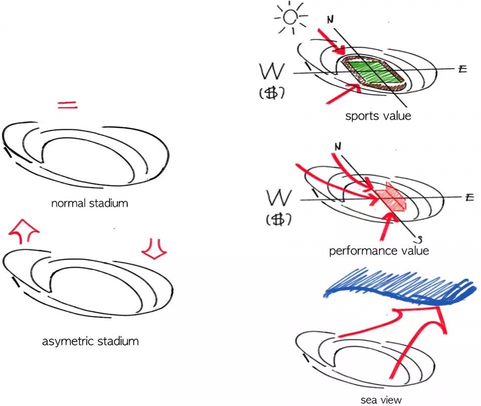 體育場主體設計打破了對稱的布局,采用了西高東低的看臺選型,把最有價值的西看臺座椅數最大化,適當壓低利用率低的東側看臺,主看臺區面朝東北側的大海及體育公園開放,令觀眾享受到獨一無二的景觀視野和良好的通風遮陽環境。