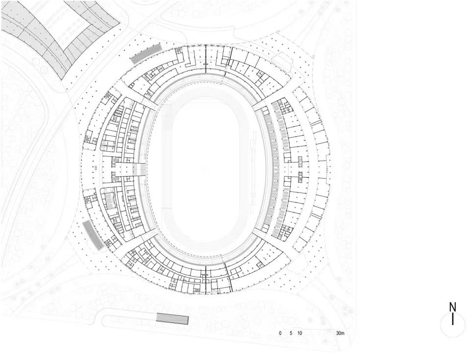 體育場內約設有41000個座席,下層看臺環通一周,上層看臺西高東低。西側配備運動員、新聞媒體及賽事管理用房等,東側則植入商業及貴賓區。體育場中央賽場設置400m的標準環形跑道。
