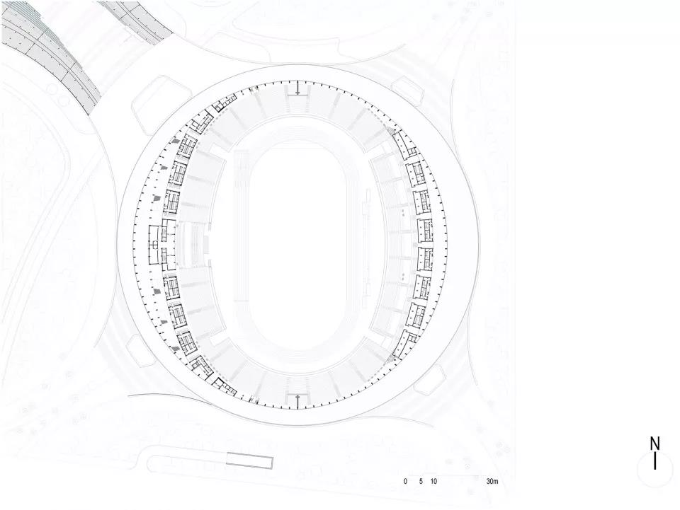 海南獨特的氣候要求體育場結構可以抵御臺風、地震、強降雨等多種極端天氣狀況,gmp與工程師事務所sbp合作完成了屋面結構設計。一座非對稱半月形索膜屋面覆蓋于西看臺上方,整個屋面跨度270m,深度65m,面積超過10000平方米。半透明的屋面膜材料為賽場內引入充足的自然光線。全張拉的屋蓋由兩條外測抗壓環和一條內抗拉環構成。