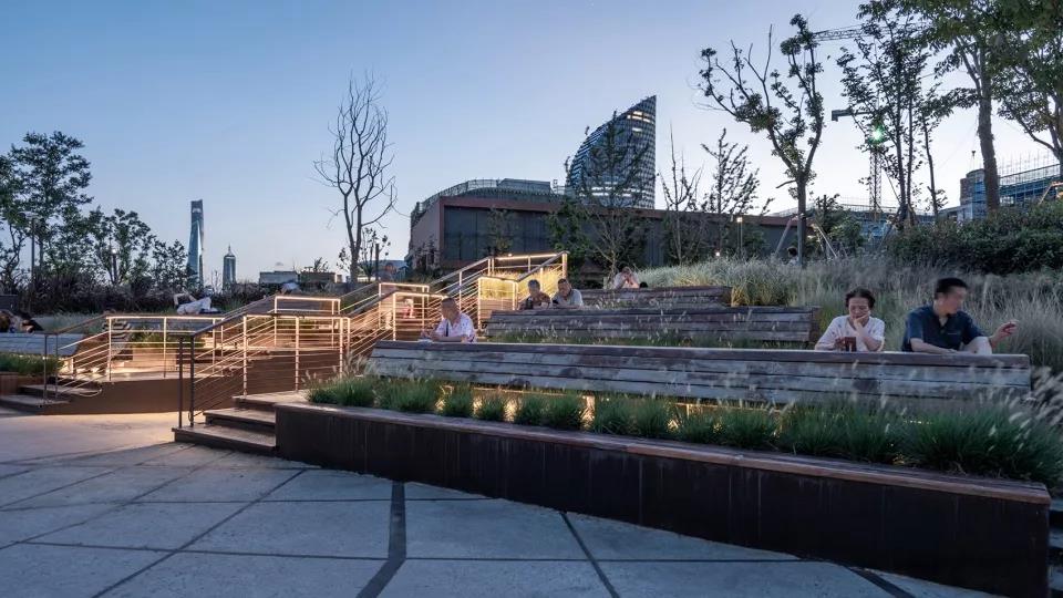 濱水空間被設定為城市看臺,轉型為新的吸引點,滿足日常使用以及舉辦重要活動,并且能夠欣賞到上海優美的天際線。在開放?日迎來了近2萬人次的到訪者,其中有曾在之前工廠工作過的老人。重振活力的濱?區以?業遺存與自然公園的共存方式,真正回歸于公眾。