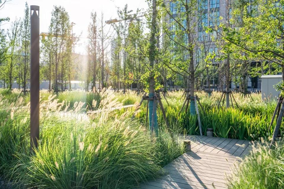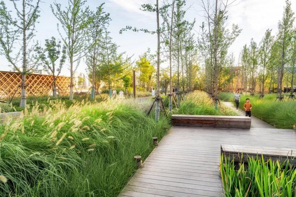 城市道路與防汛墻之間的綠地設計為雨水花園,減輕了風暴期間市政排水網絡的負擔,也使得硬混凝土墻不再是負面因素。此外,地埋式的雨水收集裝置,為綠地提供了灌溉用水。 林下的架空木棧道和休憩平臺節點作為生態教育的空間,可以幫助人們進入并了解海綿城市的意義。