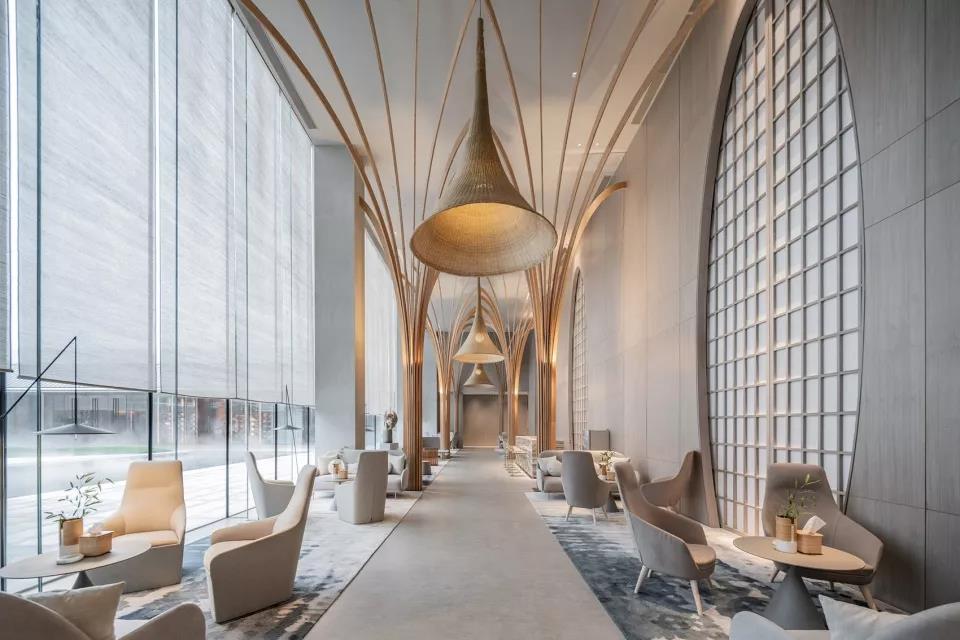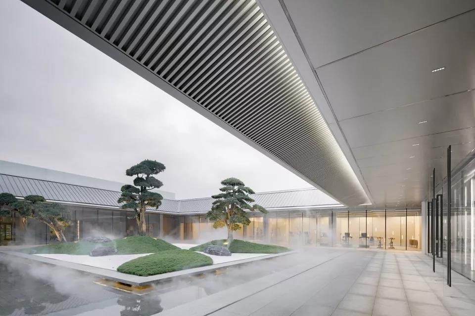 外廊通過延展的玻璃面、大尺度的灰空間、盆景式的內院,實現從室內到室外,由建筑到景觀無界限的自然延續。為了給近人尺度提供舒適的空間體驗,設計將大挑檐拆分成平屋面與坡屋面兩個層次。