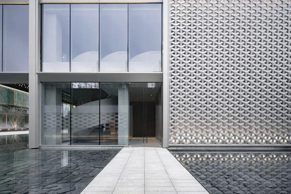 前堂是兩層高的展示空間,內有一組具有序列感的三連展廳和舒適的洽談空間。主樓朝向城市一側的公共界面,用大面的金屬編織網和玻璃面,打造具有神秘感的藝術氣質,朝向內院一側的私密界面,用8.6m通高的大玻璃面,表達完全開放的自由態度。