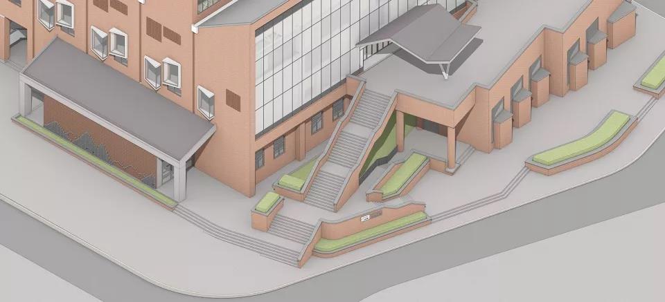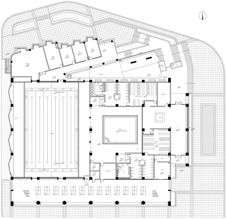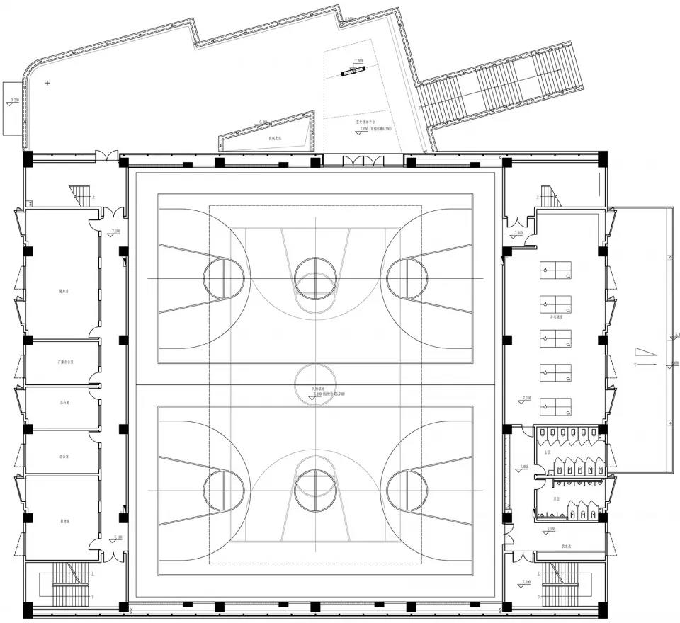 二樓的籃球館從東北側大臺階進入,由于距離道路過近且道路南北向存在高差,我們對臺階進行了復雜的變向和標高設計,使之既符合人流來向,又成為空間環境的一部分。