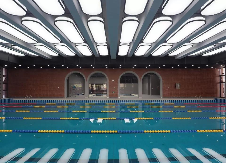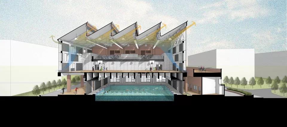體育館一層為游泳池、二層是籃球館。考慮到建筑節能,設計者把游泳池設計成封閉的空調空間,二層的籃球館是非空調區域,通過幕墻和天窗設計形成空氣的自然流通。
