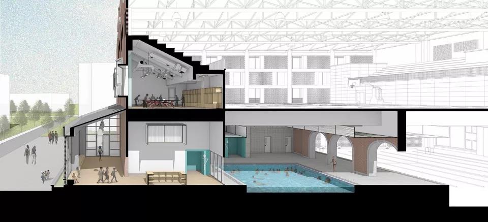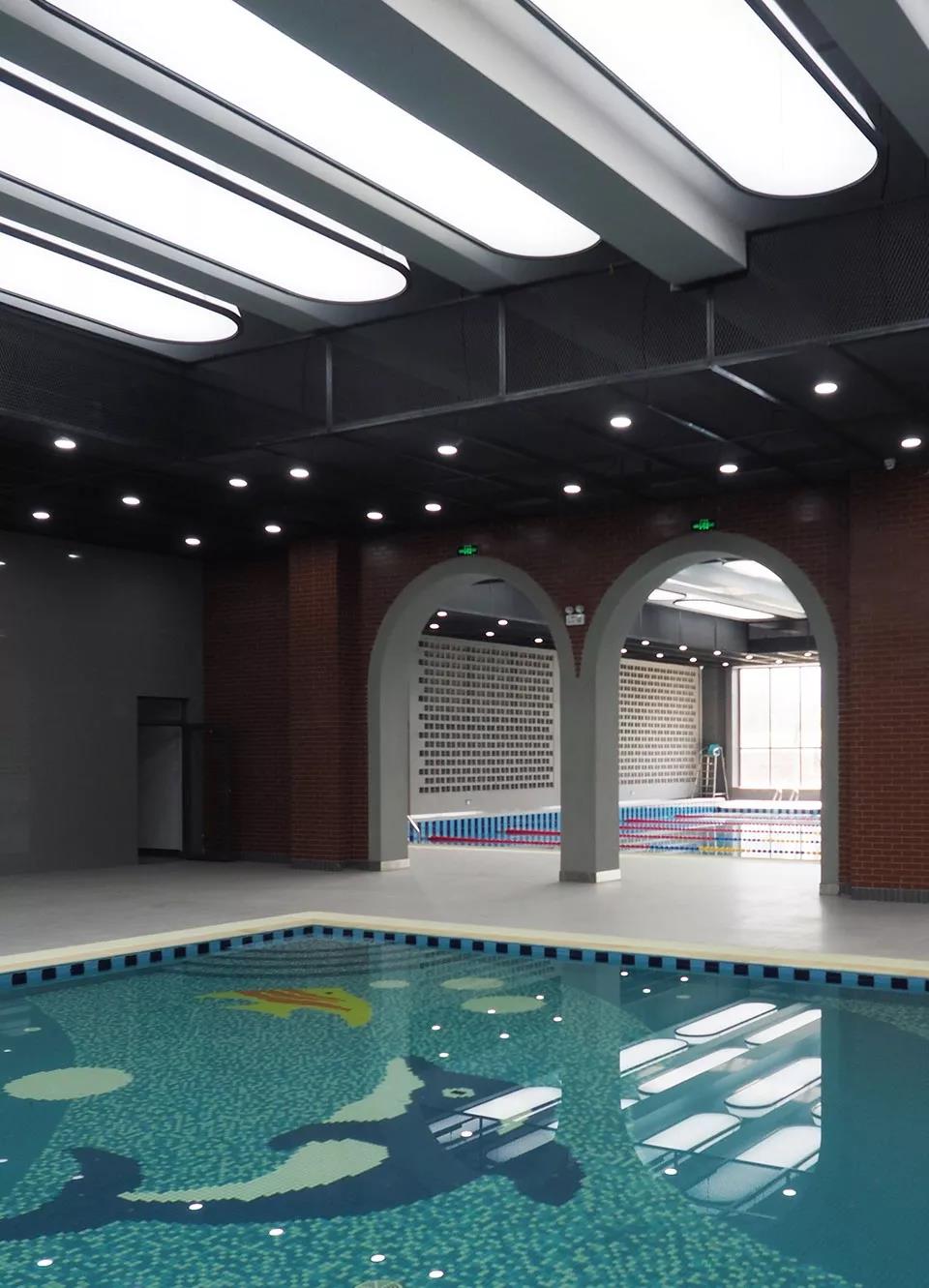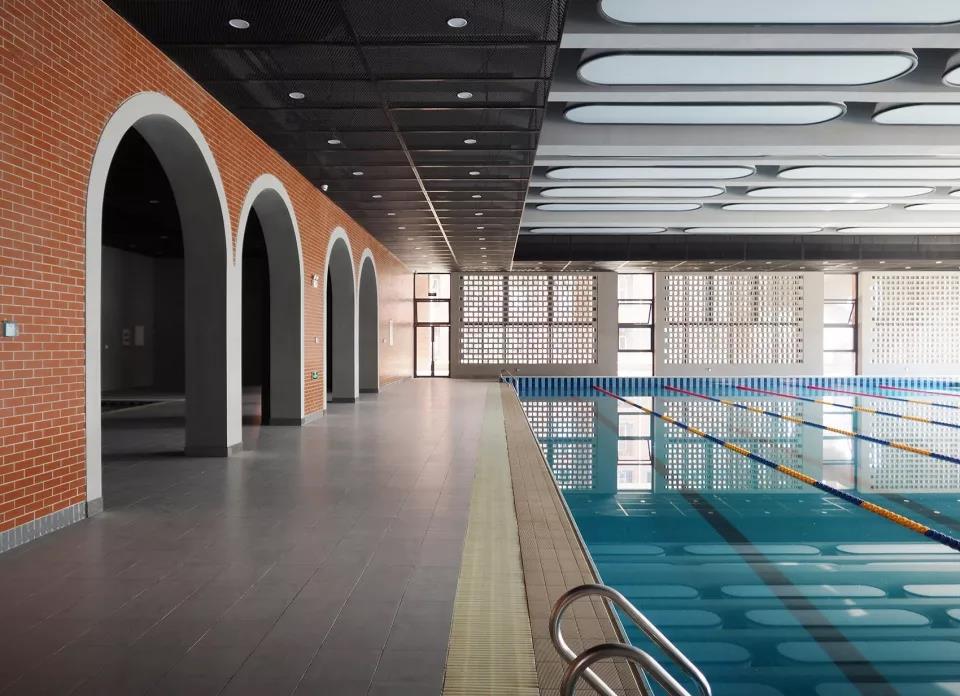 一樓的游泳館從西側門廳進入,由于與教學樓距離較近,入口位置設在門廳的南北兩側,朝向教學樓東入口的一面被設計成一面鏤空的磚墻,并通過磚的砌筑形成一幅山水畫卷,以隱喻徽州多山的地理環境。